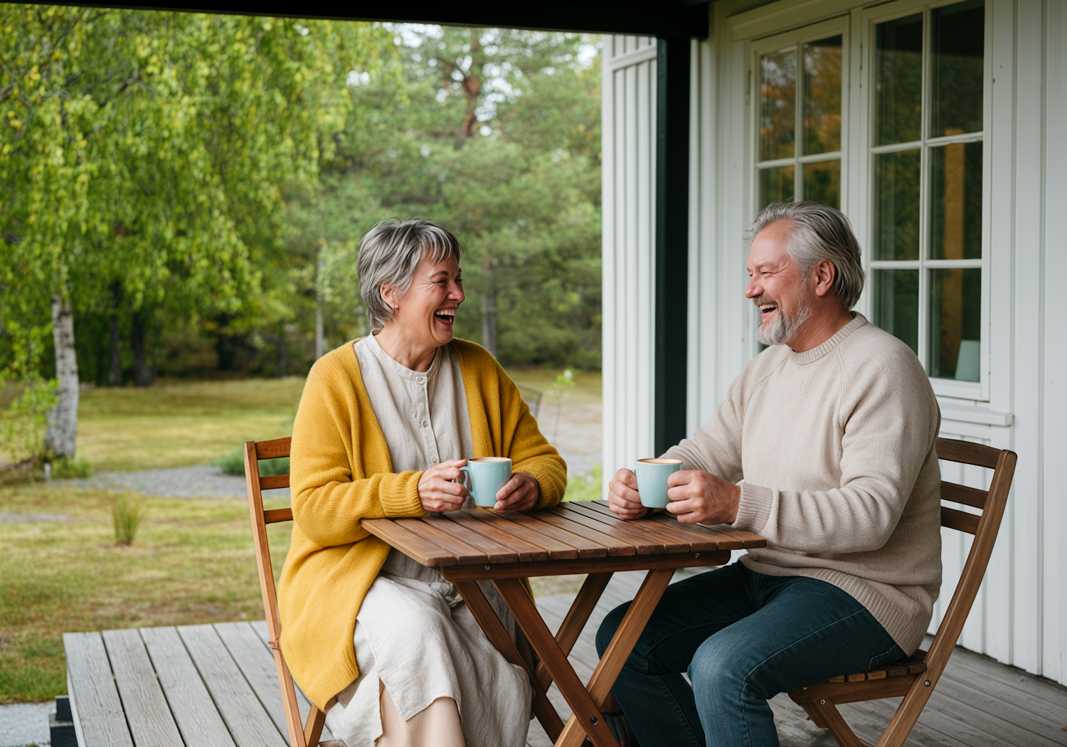 A cheerful older couple enjoys coffee on a patio surrounded by greenery, sharing laughter and creating a warm, inviting atmosphere.
