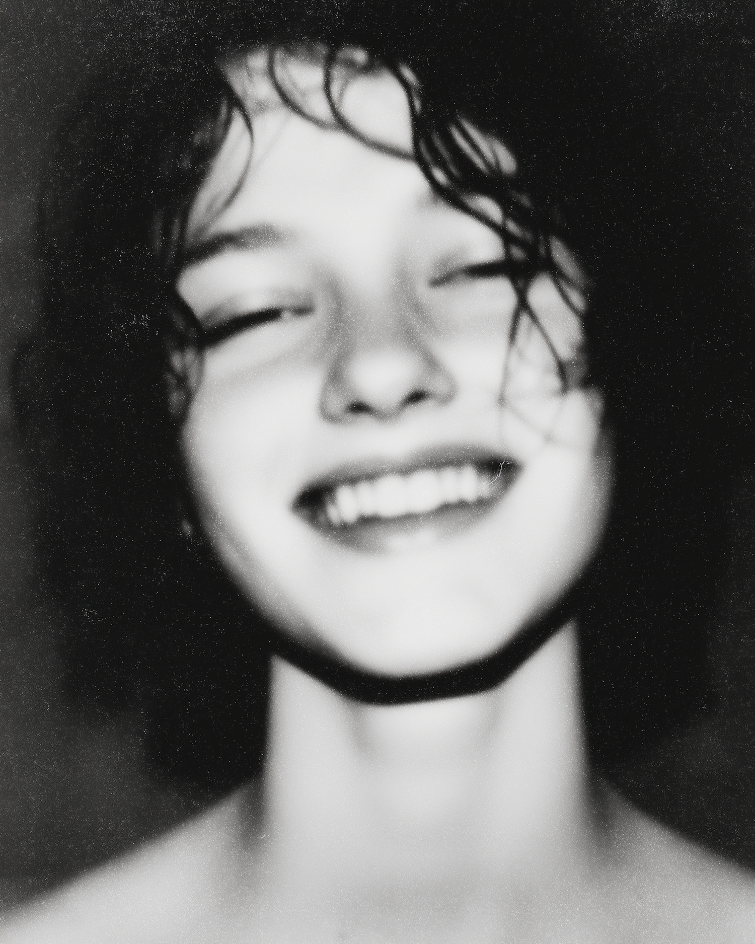 Grainy black-and-white close-up of a smiling person with closed eyes, short curly hair, and a joyful expression.