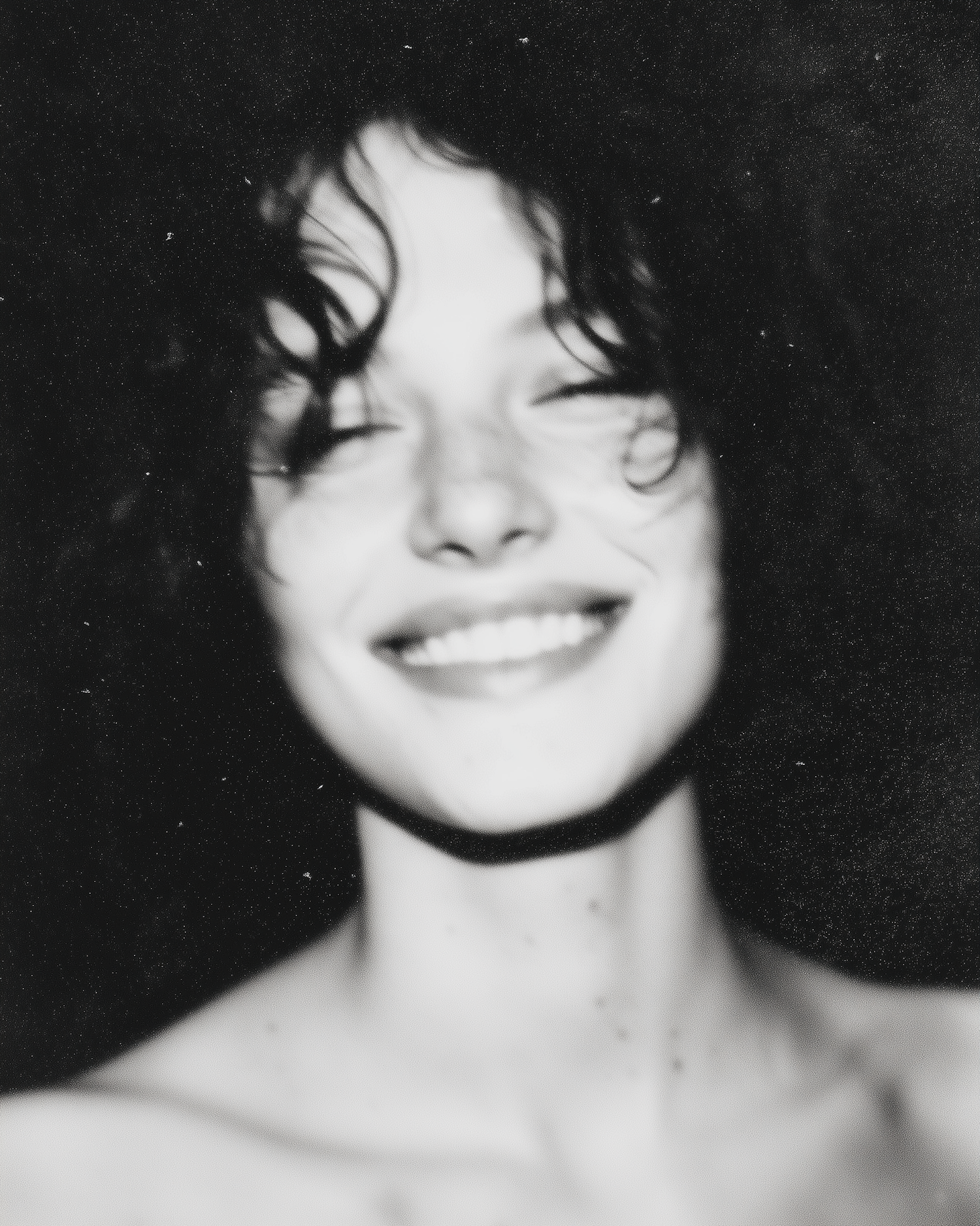 Grainy black-and-white portrait of a smiling person with curly hair and closed eyes, exuding a vintage, film-like aesthetic.