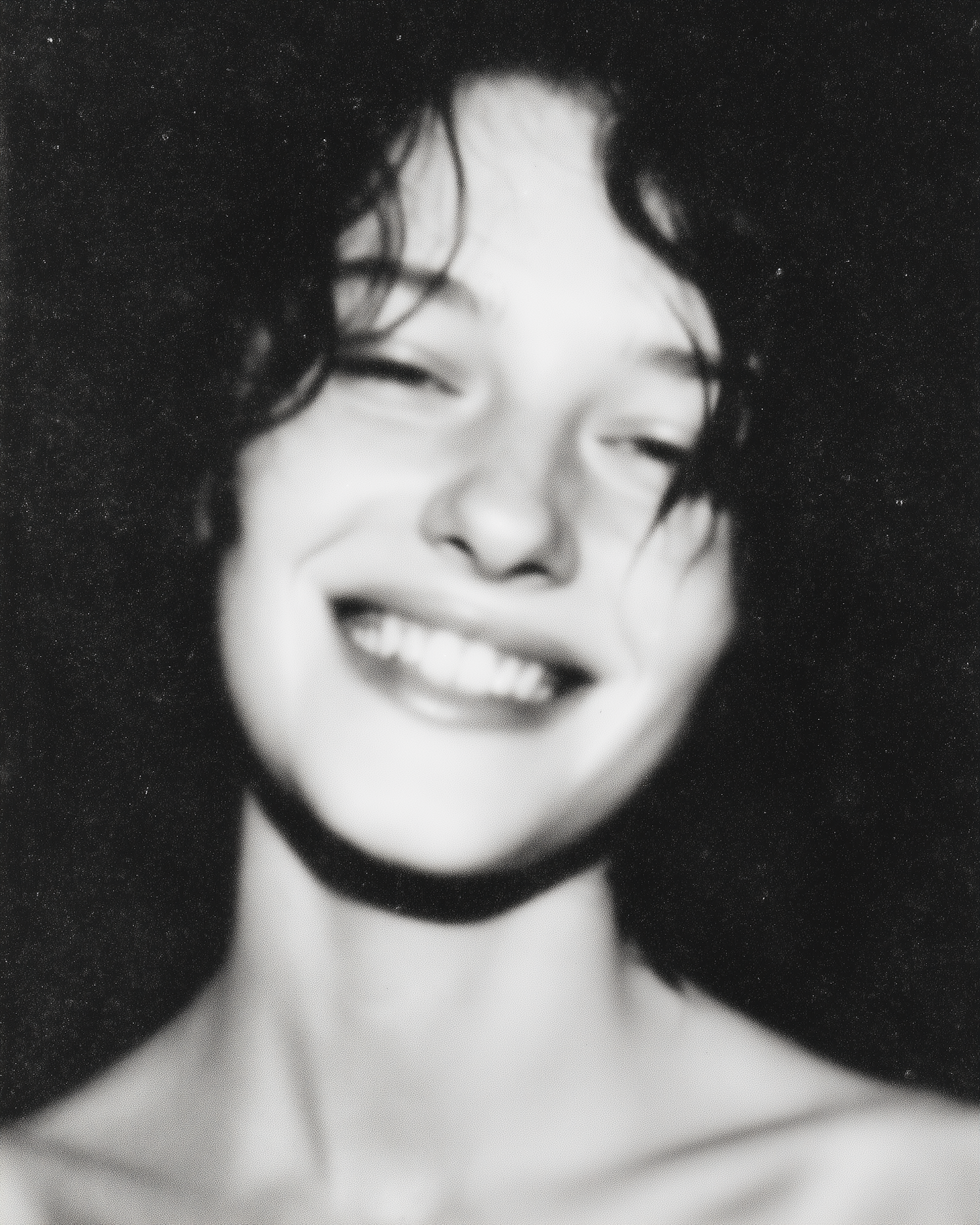 Black-and-white portrait of a smiling young woman with wavy hair, soft focus, and a nostalgic, dreamy atmosphere.