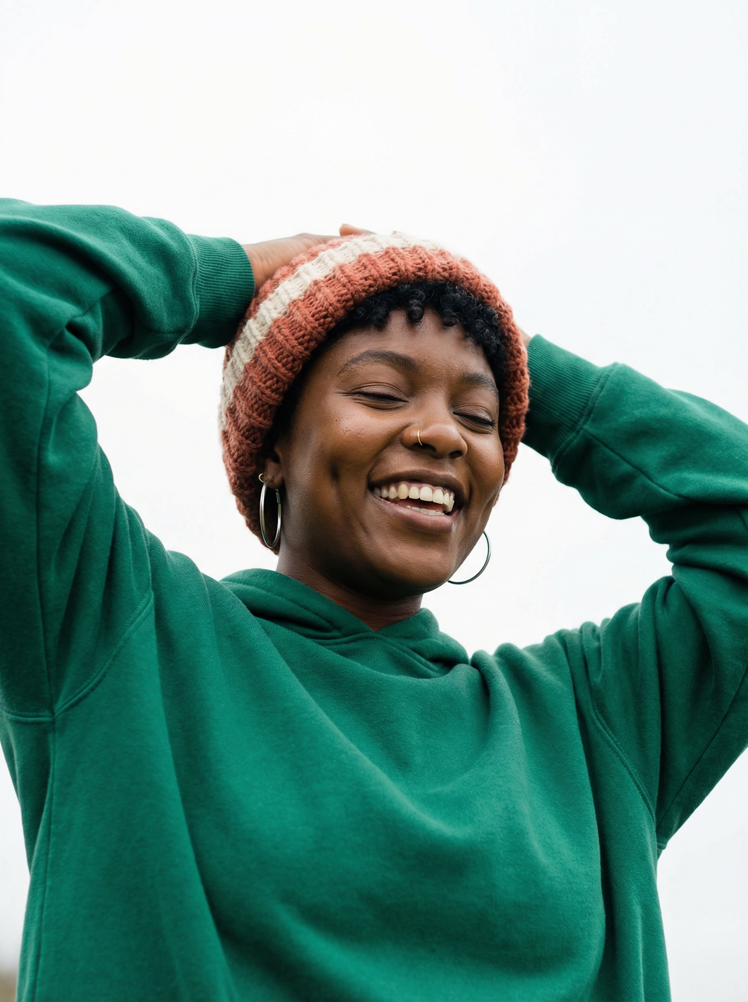 A cheerful individual in a green hoodie and striped knit hat smiles brightly against a soft, cloudy background.