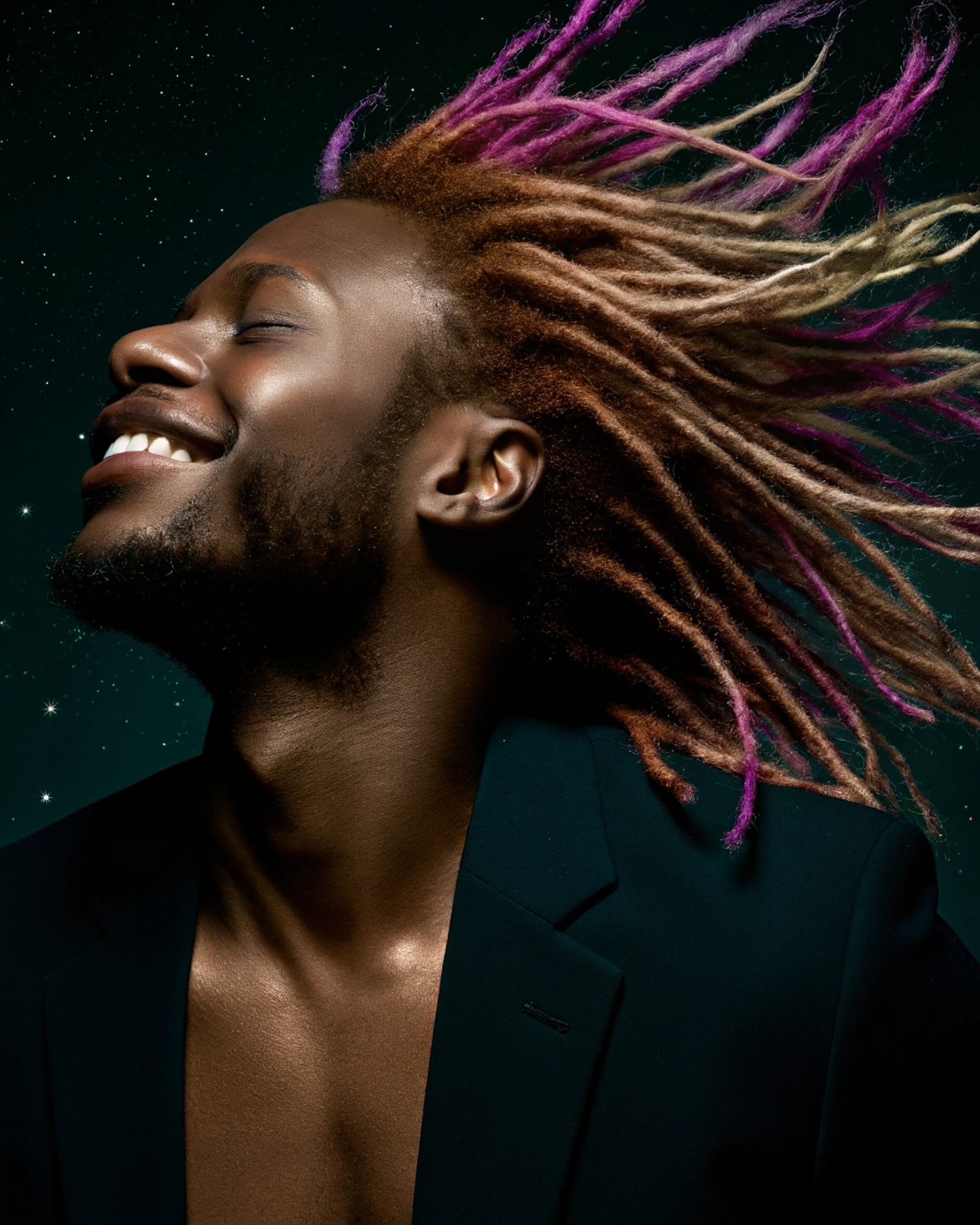 A joyful man with vibrant dreadlocks and a dark blazer against a starry night sky, radiating energy and elegance.
