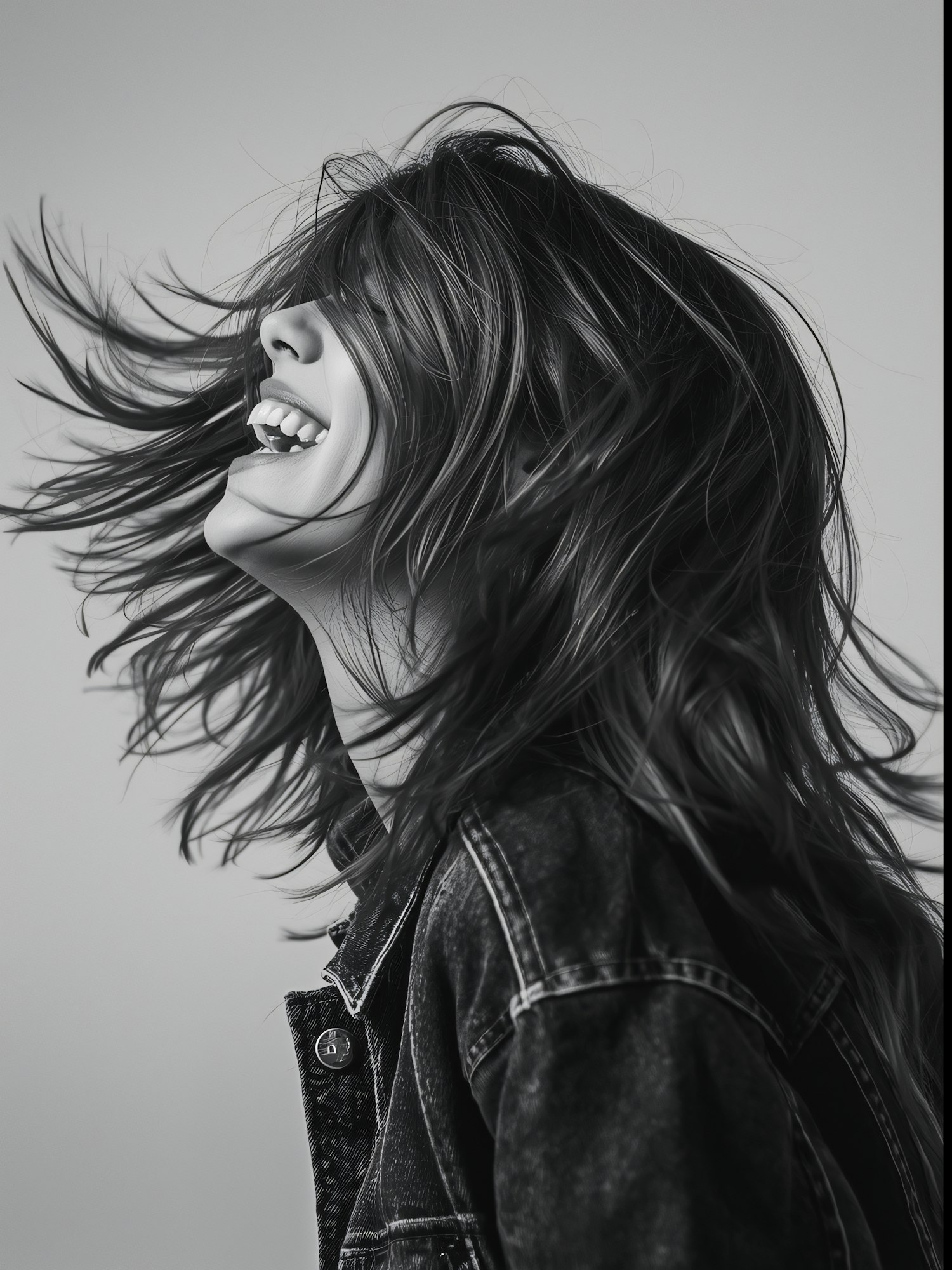 Black-and-white photo of a smiling woman with flowing hair, wearing a denim jacket, captured in a moment of joy and movement.