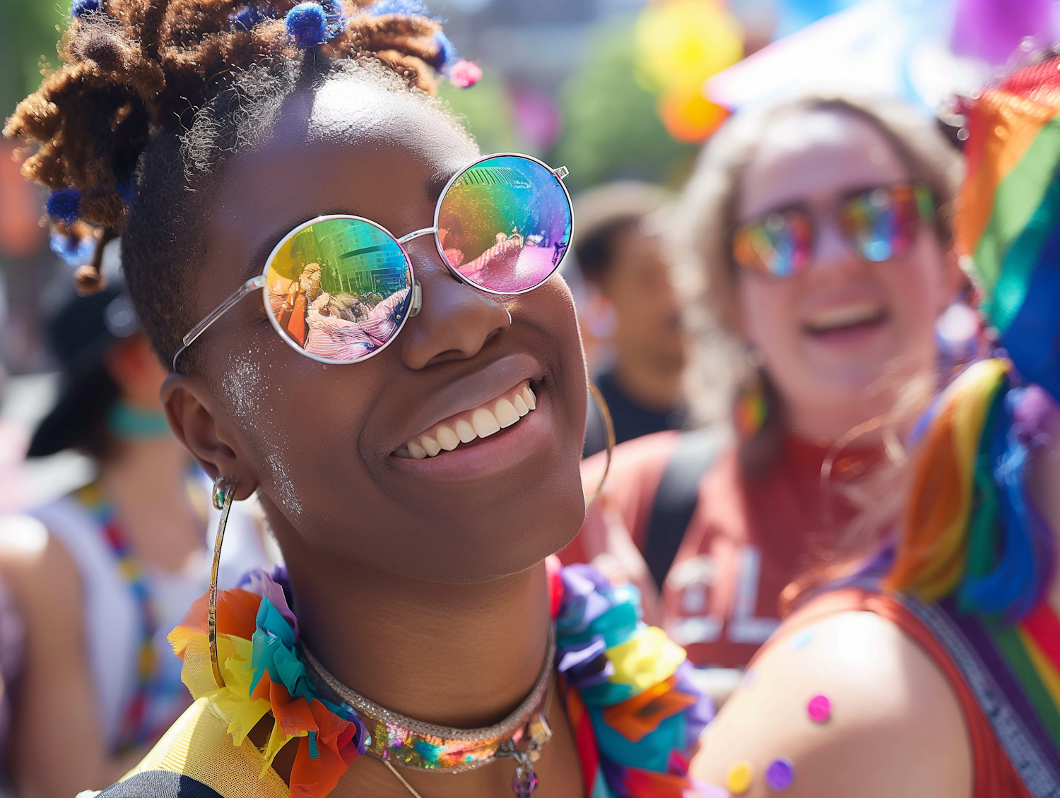 Joyful celebration with vibrant colors, featuring smiling individuals with rainbow accessories and reflective sunglasses.