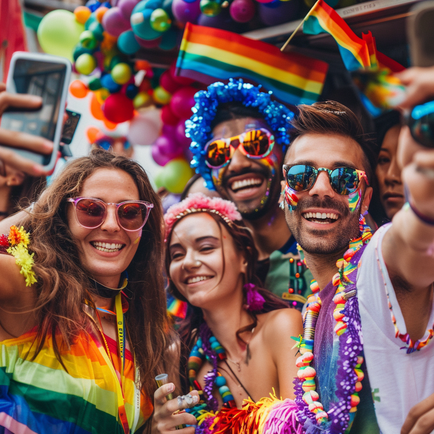 Joyful group celebrating at a pride event with colorful outfits, rainbow flags, and balloons, capturing a vibrant and festive atmosphere.