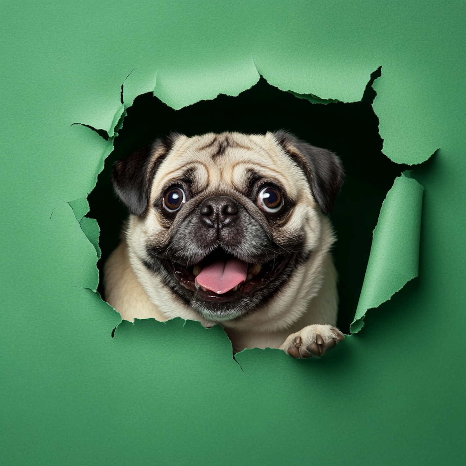 A joyful pug peeks through torn green paper, showcasing its playful expression and curious nature.