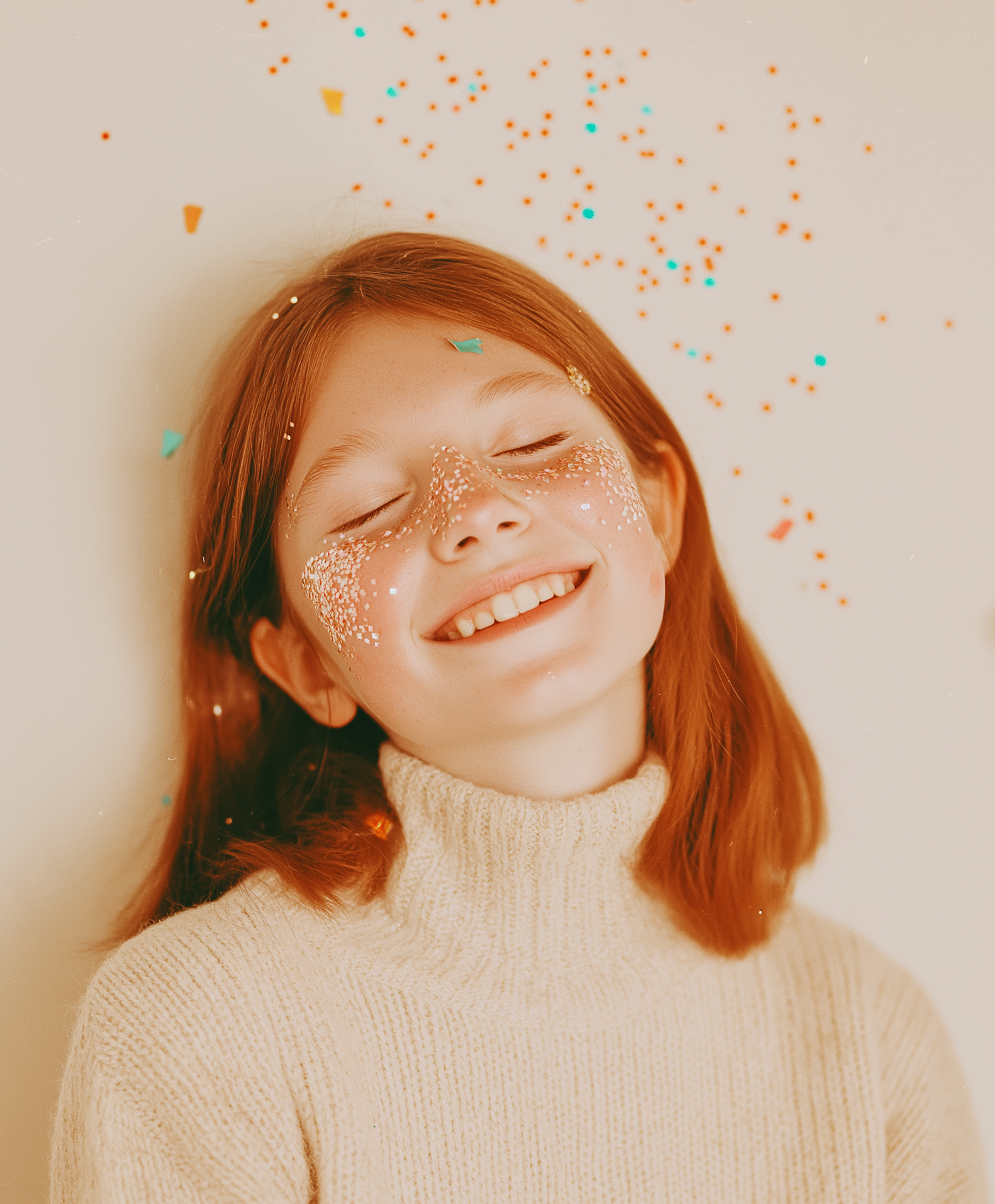 Joyful girl with red hair and glittered cheeks, smiling in a cream sweater with colorful confetti around her.