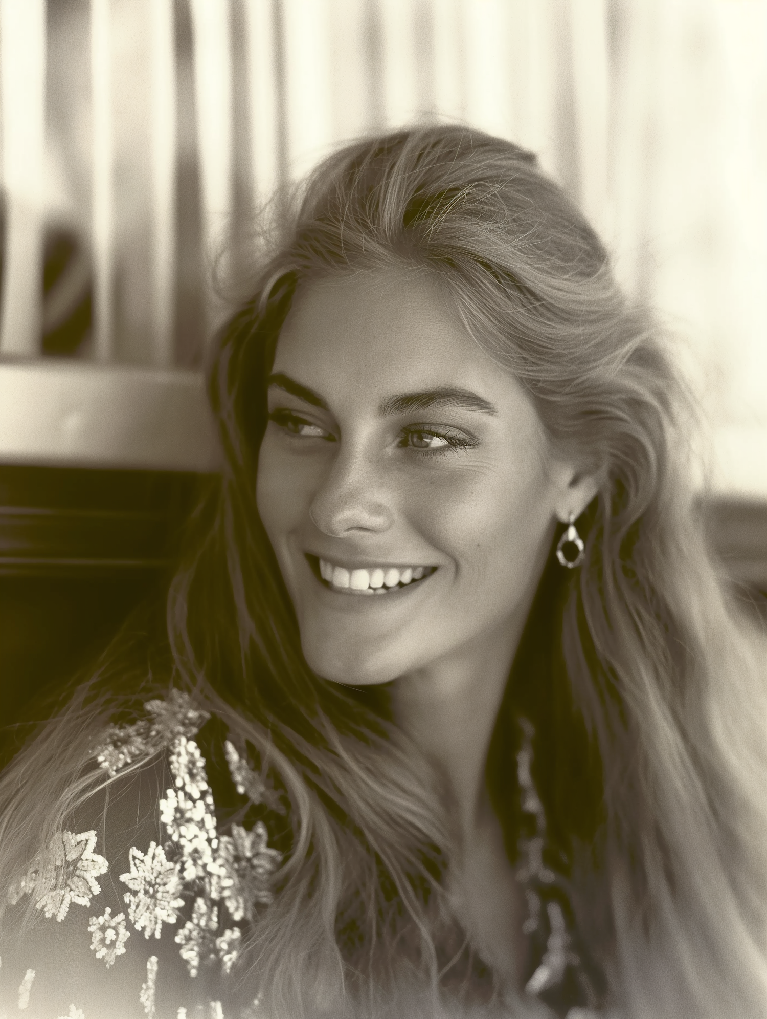 Sepia-toned portrait of a smiling woman with blonde hair and floral top, exuding warmth and joy.