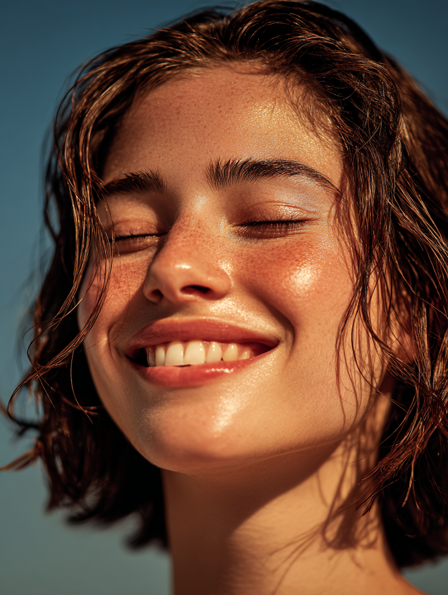 Close-up of a smiling woman with freckles and glowing skin under sunlight, set against a clear blue sky.