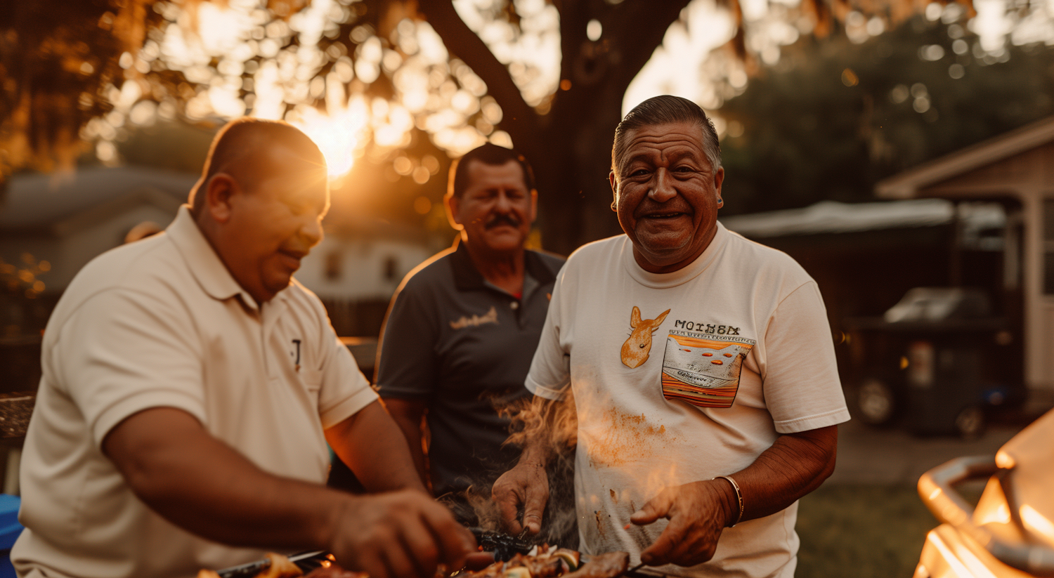 Three men enjoy a backyard barbecue at sunset, sharing smiles and laughter in a warm, golden glow.