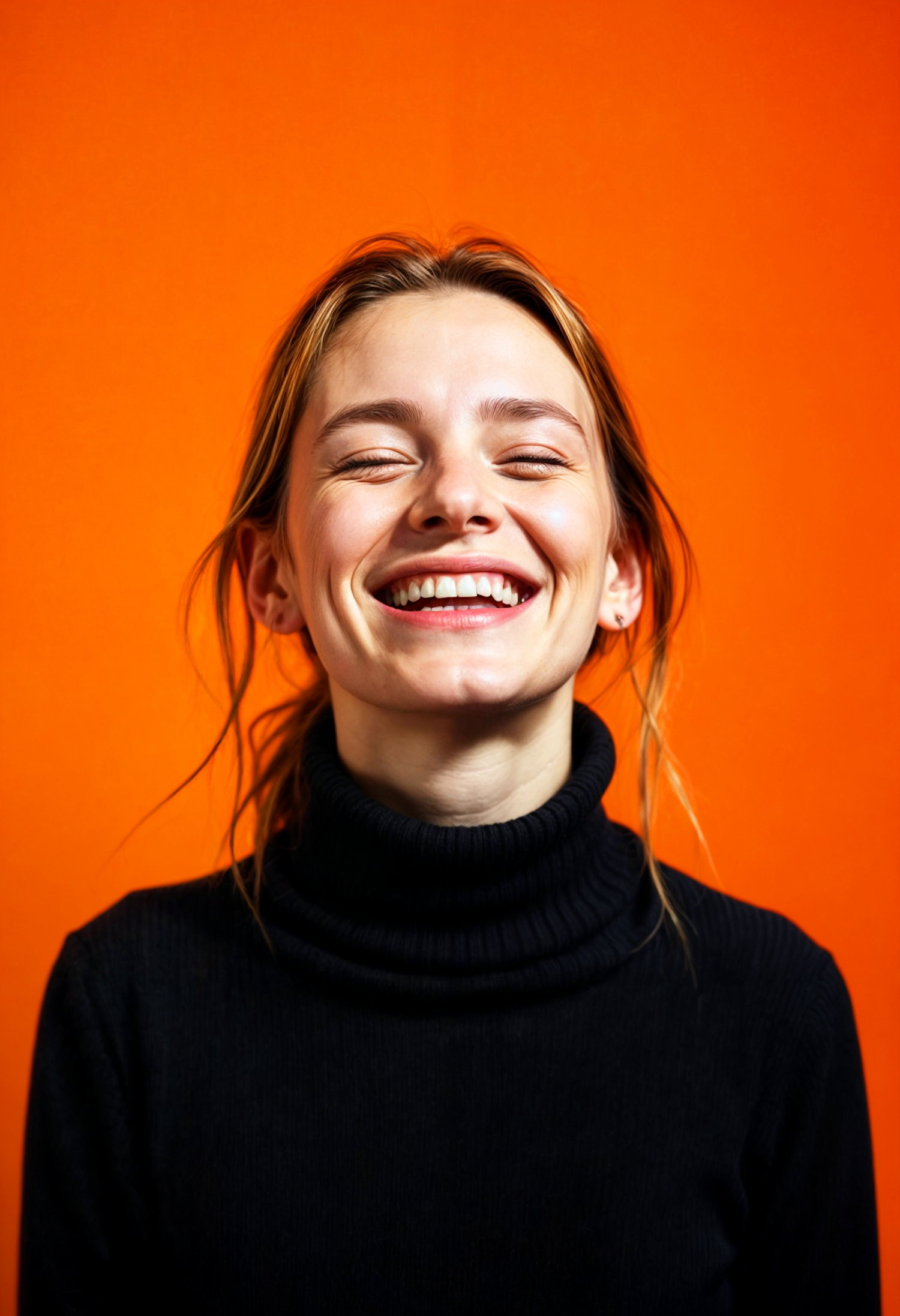 Joyful woman in black turtleneck against vibrant orange background, smiling with eyes closed, exuding warmth and happiness.