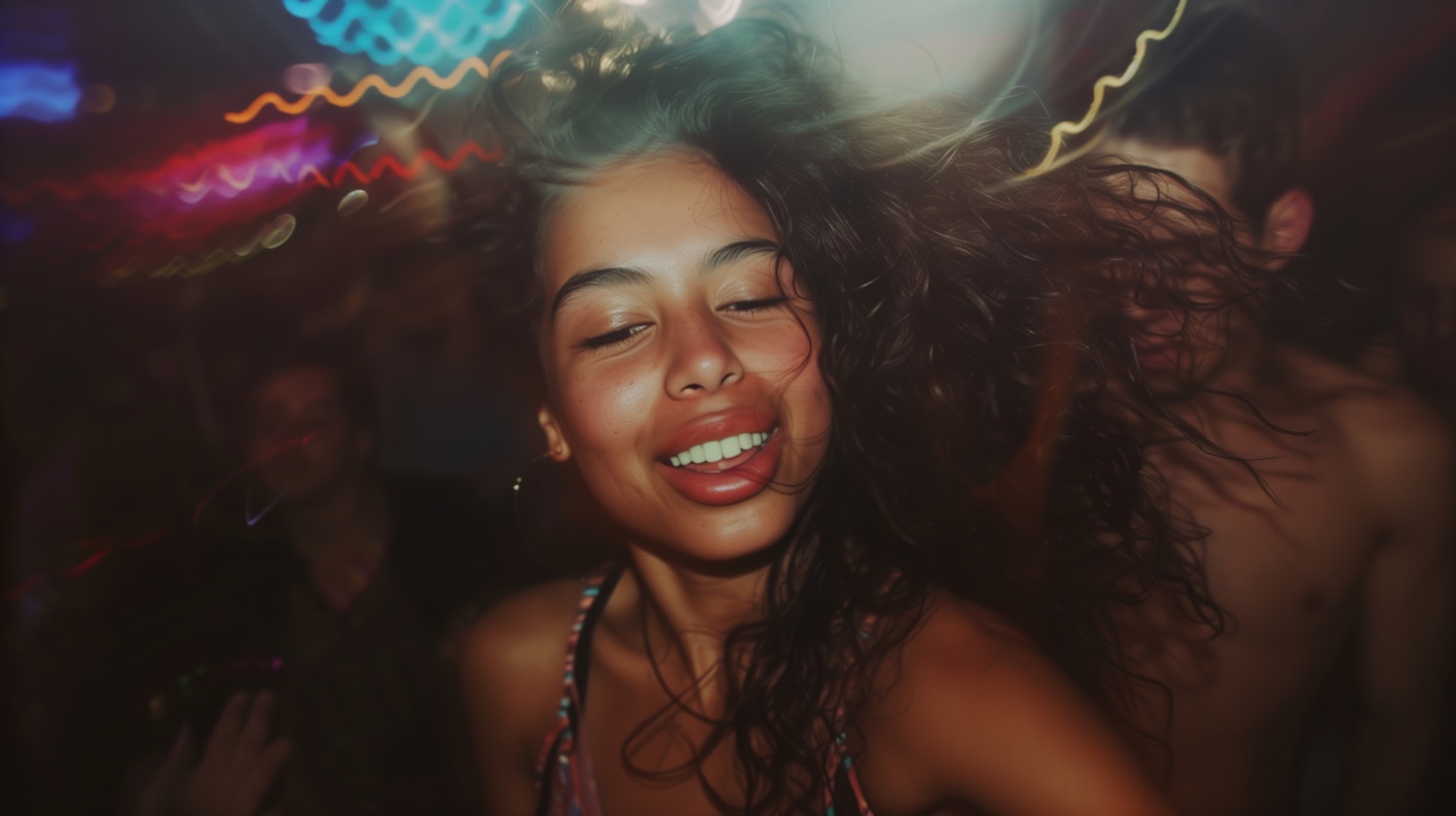 Joyful woman with curly hair dancing in a vibrant, colorful party atmosphere with blurred lights.
