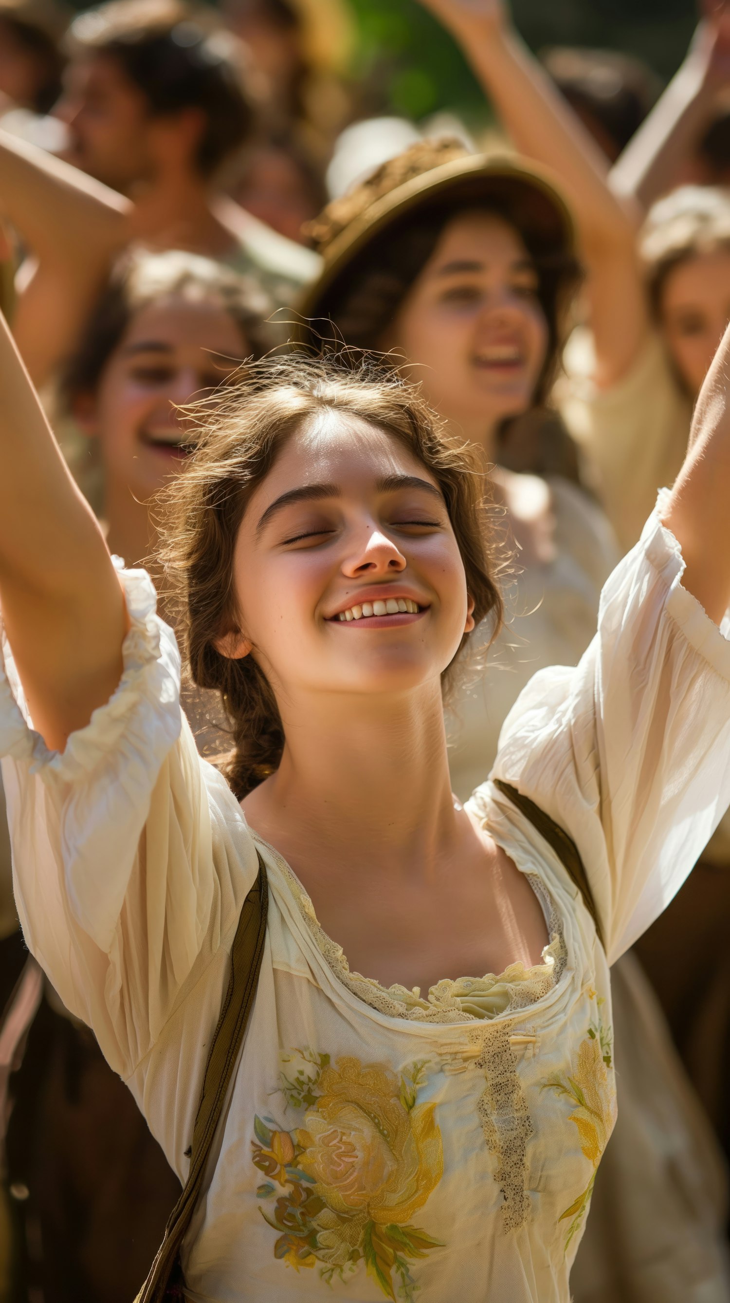 Joyful young woman in vintage-style white blouse with floral embroidery, celebrating outdoors with a cheerful crowd in warm sunlight.