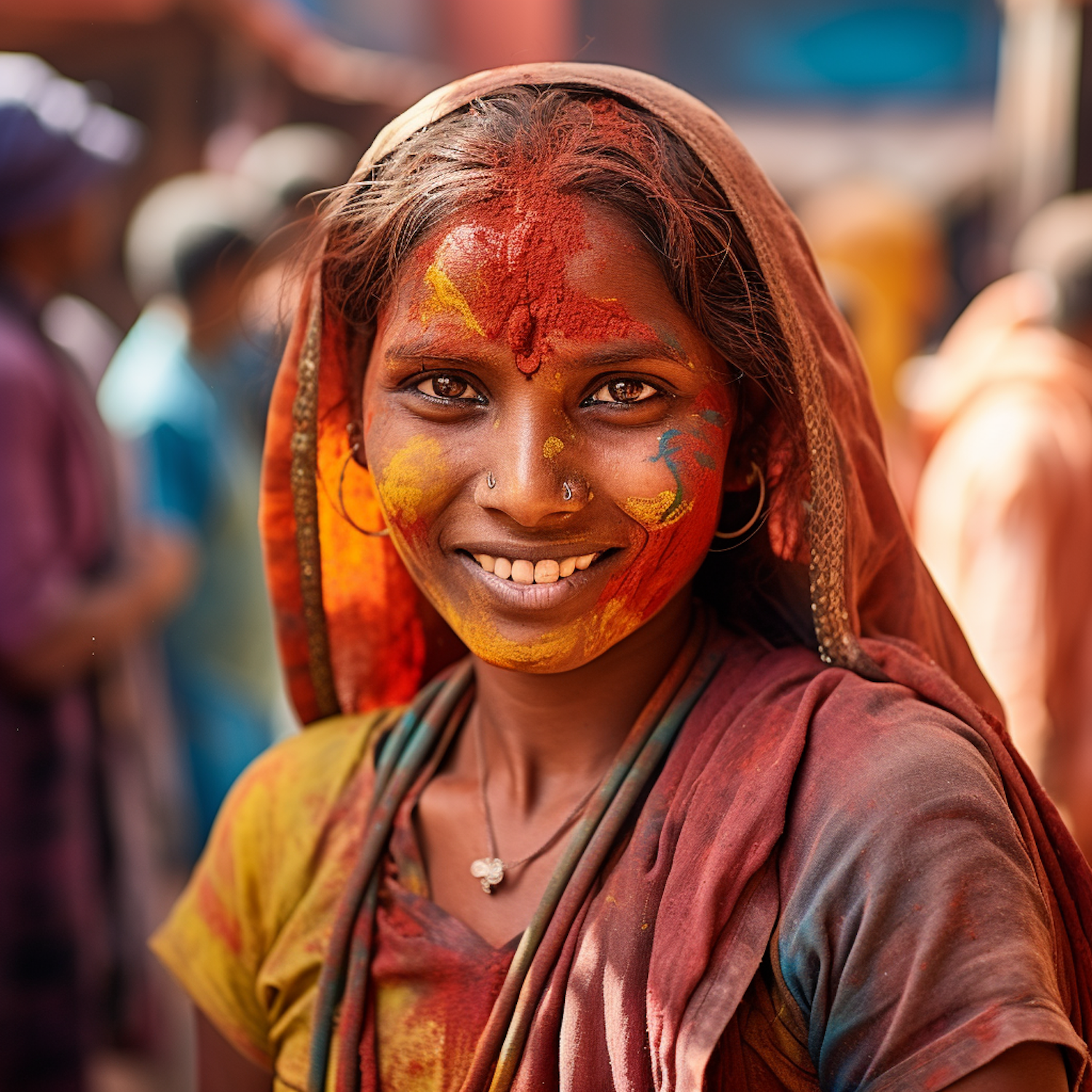 Smiling woman with colorful face paint during a festival, wearing traditional attire and jewelry, in a vibrant, festive setting.