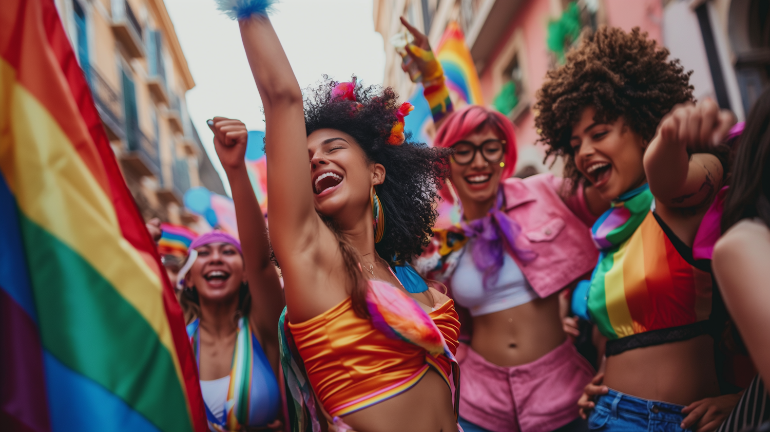 Joyful celebration with diverse individuals in colorful outfits and rainbow flags, embodying pride and inclusivity.