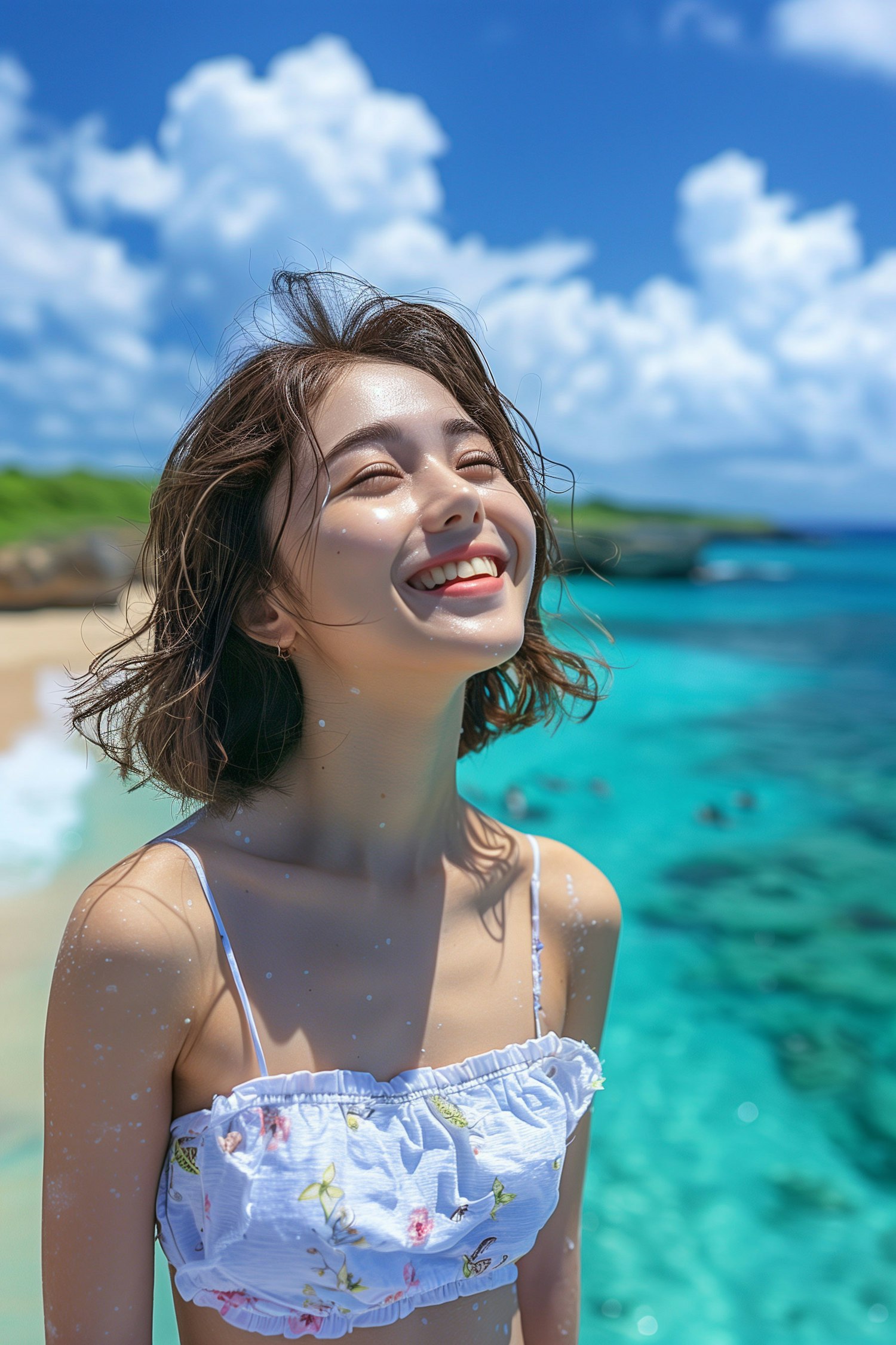 Joyful woman with short brown hair enjoying a sunny day at the beach, wearing a floral top against a turquoise ocean backdrop.
