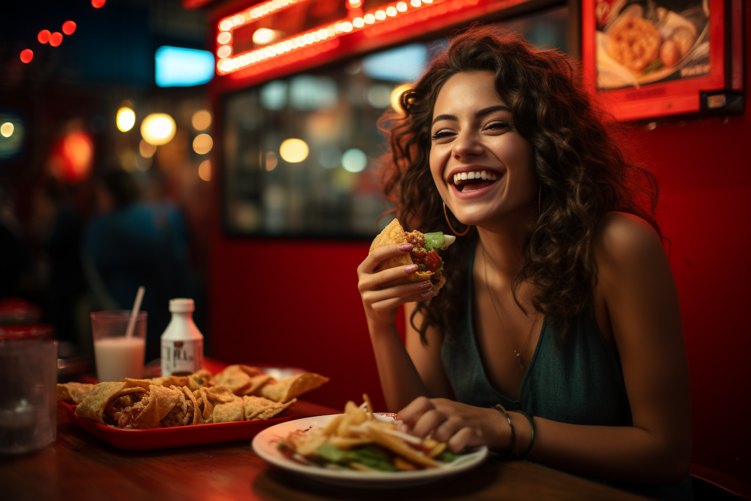 Smiling woman with curly hair enjoys tacos in a vibrant restaurant setting with warm lighting and colorful decor.