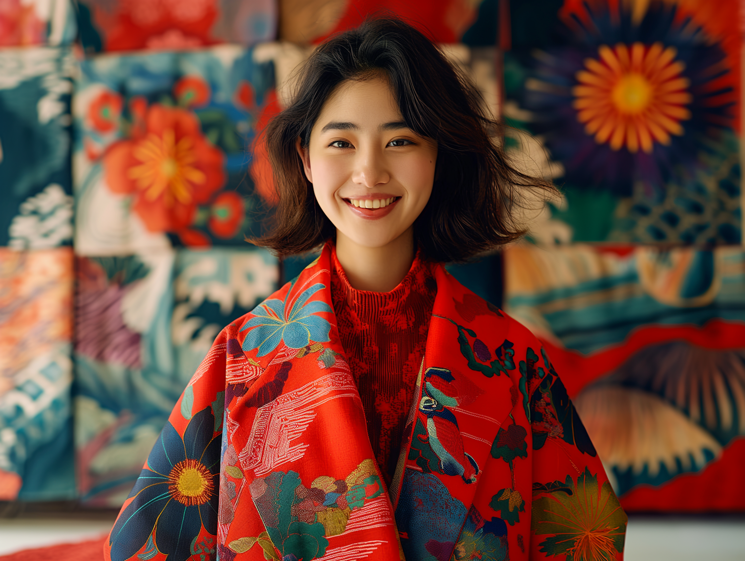 Smiling Asian woman in a vibrant red floral kimono against a colorful tapestry background.