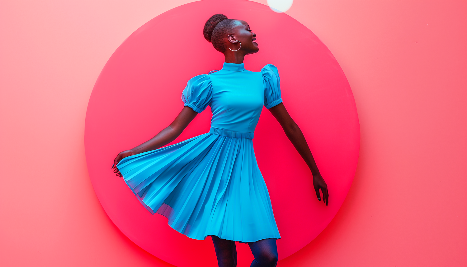 Elegant woman in a blue dress against a vibrant pink background, exuding joy and style with a dynamic pose and bright colors.