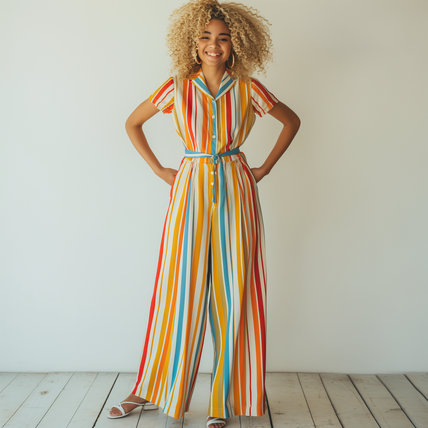 Smiling woman in a colorful striped jumpsuit with curly hair, standing confidently on a wooden floor against a light background.