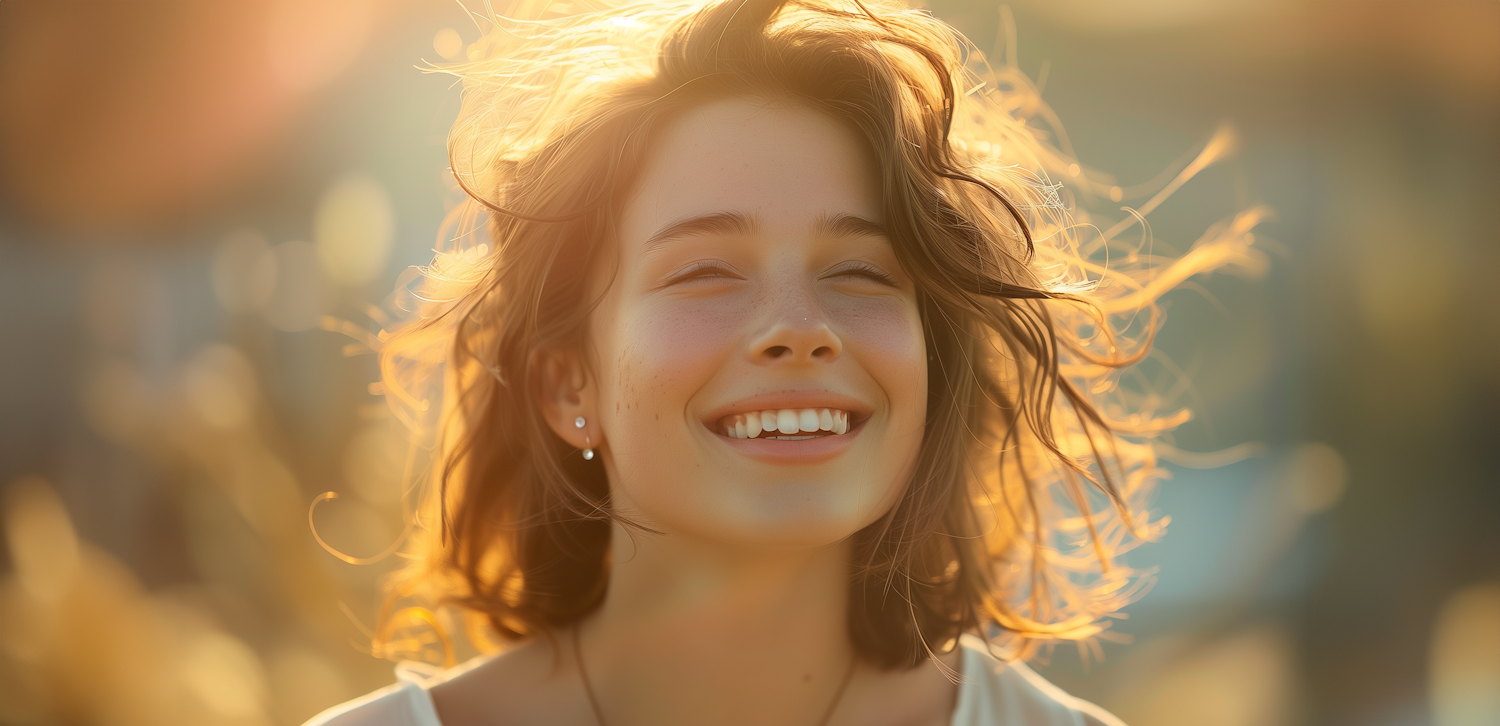 A young woman with brown hair smiles joyfully in the golden sunlight, her hair tousled by a gentle breeze, creating a warm, carefree scene.