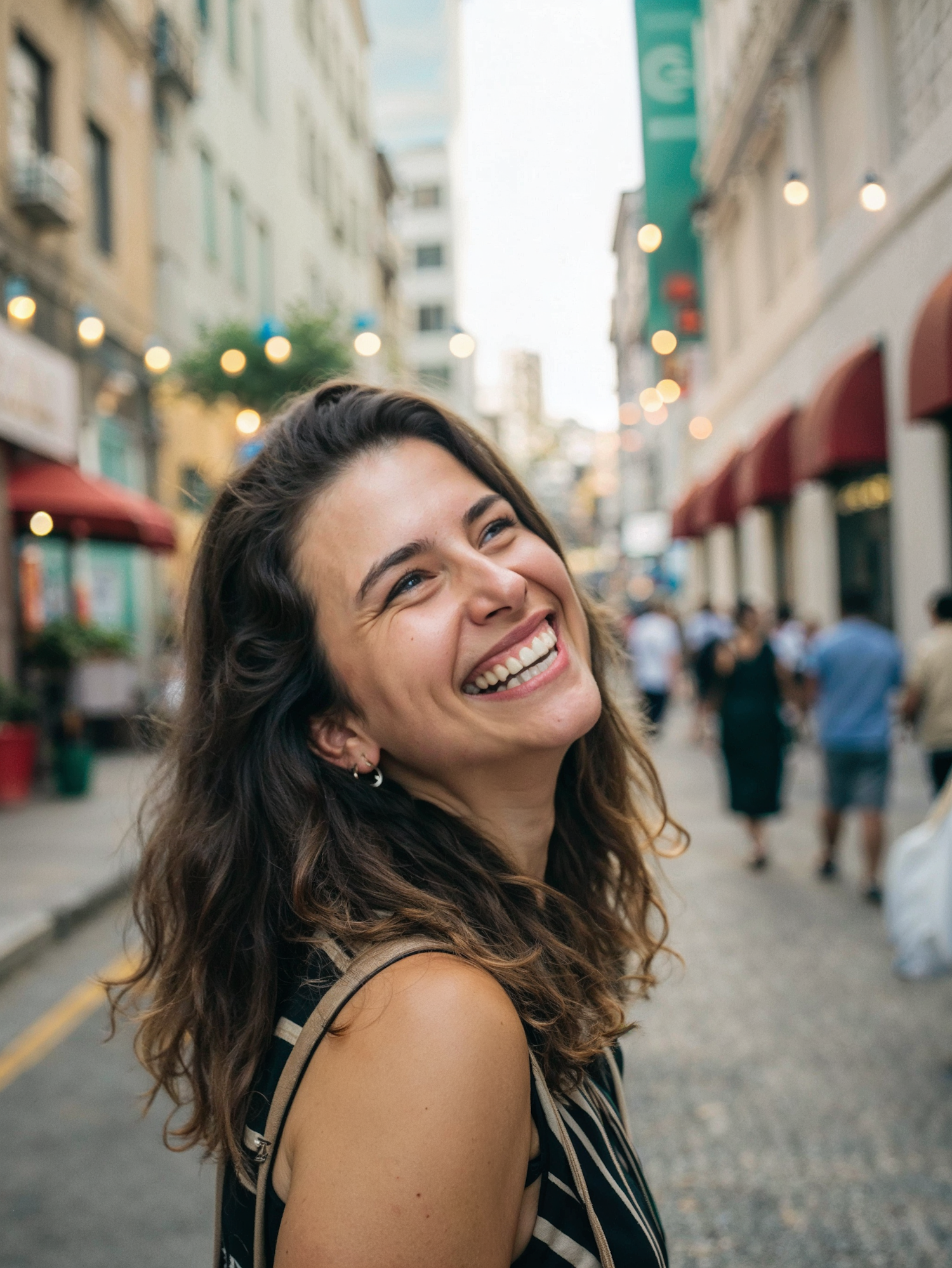 Joyful woman with wavy brown hair smiling on a lively city street, surrounded by blurred pedestrians and warm urban lighting.