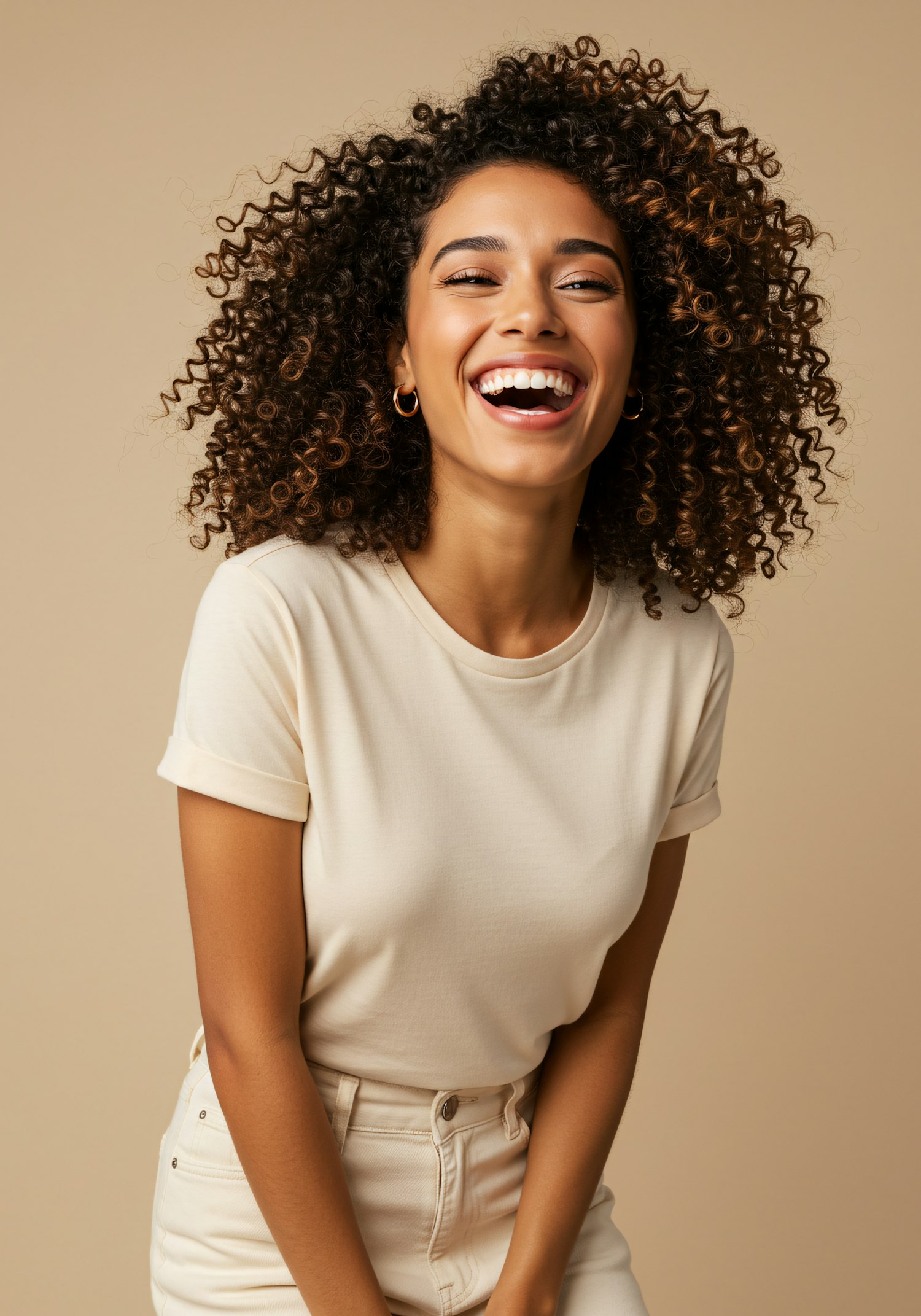A cheerful woman with curly hair and a beige outfit smiles brightly against a warm, neutral background.
