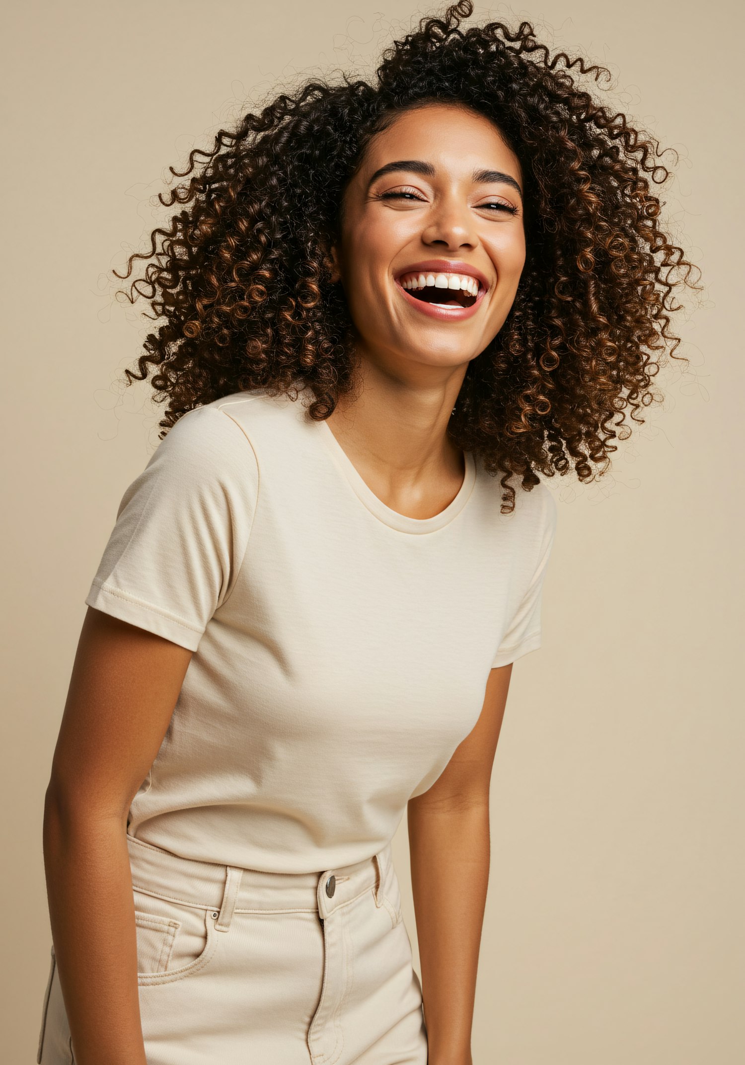A cheerful woman with curly hair in a beige outfit smiles brightly against a neutral background, radiating positivity and warmth.