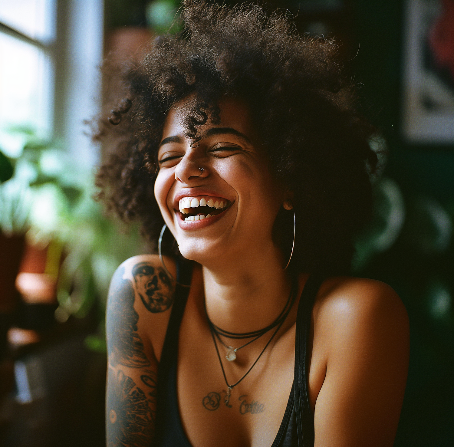Joyful woman with curly hair, hoop earrings, and tattoos, laughing in a sunlit room with plants. Captures a moment of happiness.