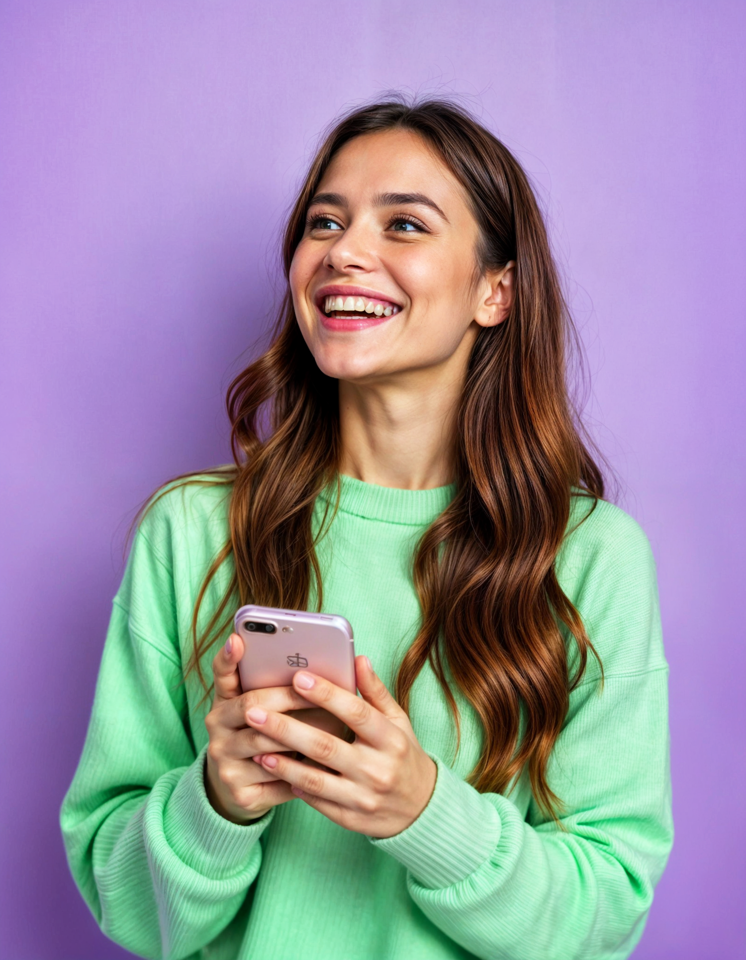 Smiling woman in green sweater holding a smartphone against a lavender background, exuding joy and positivity.