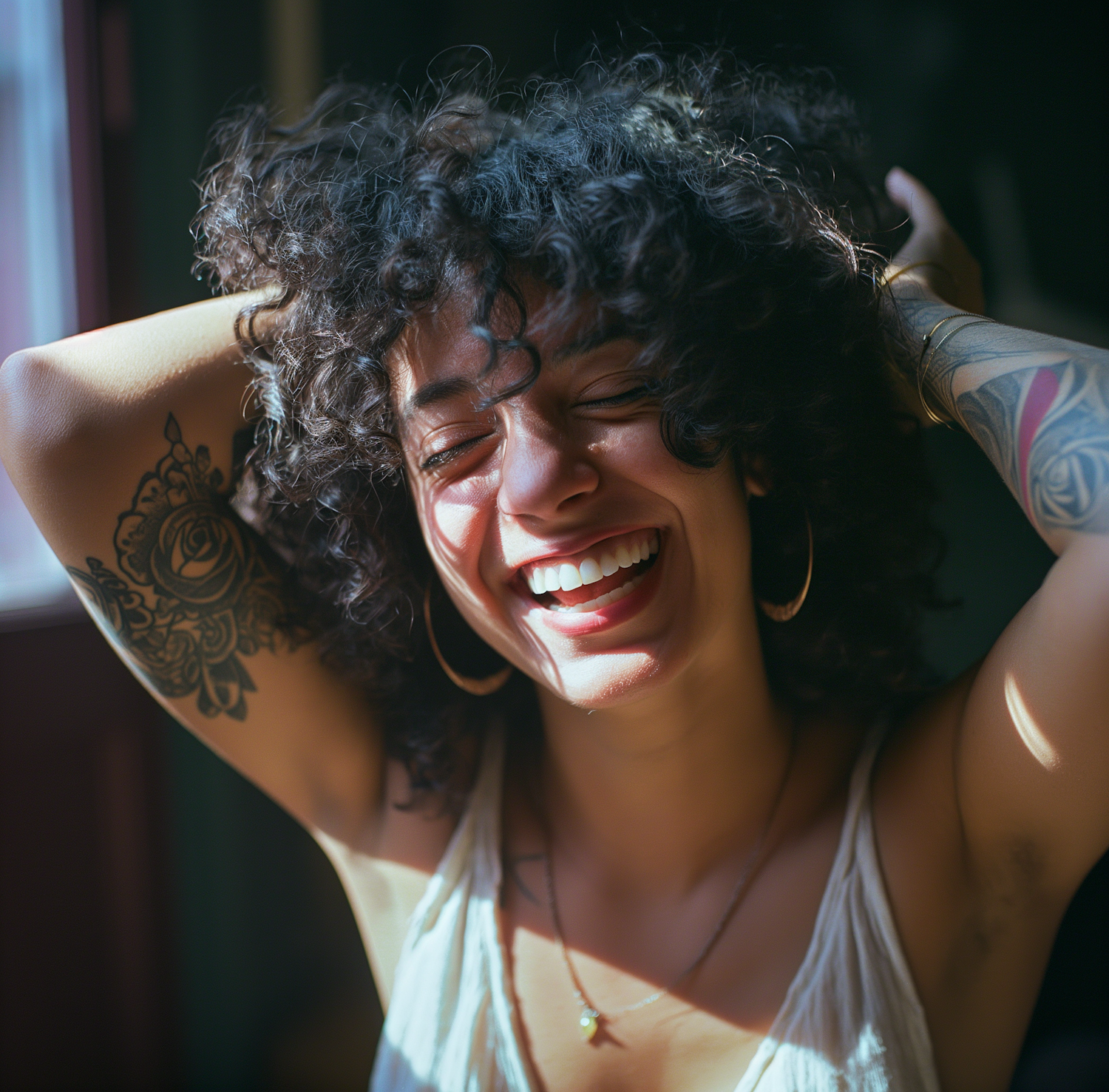 Joyful woman with curly hair and tattoos laughing in sunlight, wearing hoop earrings and a sleeveless top.