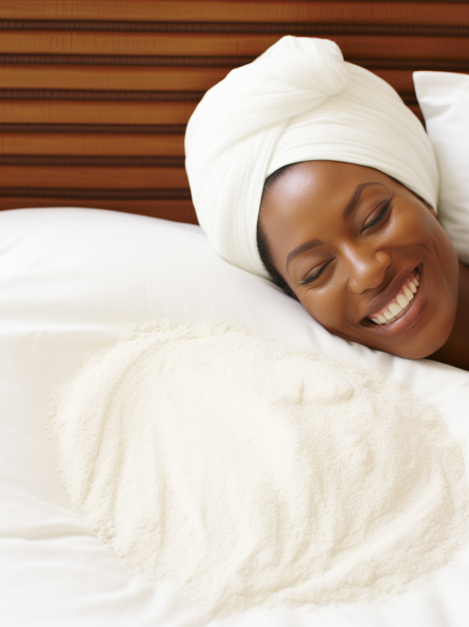 A smiling woman with a white turban rests on a pillow covered in white powder, creating a serene and joyful atmosphere.