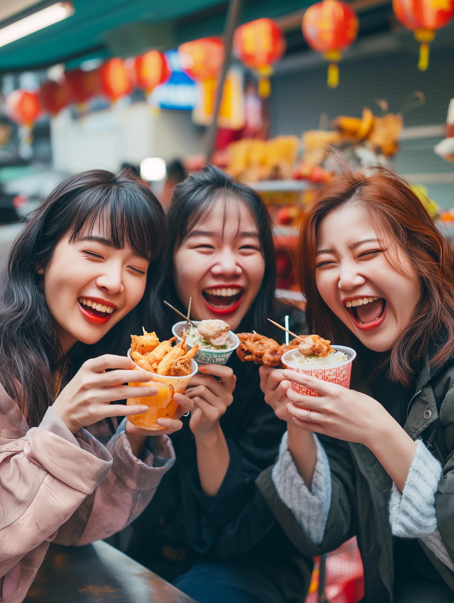 Three friends enjoying street food at a vibrant market, surrounded by festive red lanterns, sharing laughter and joy.