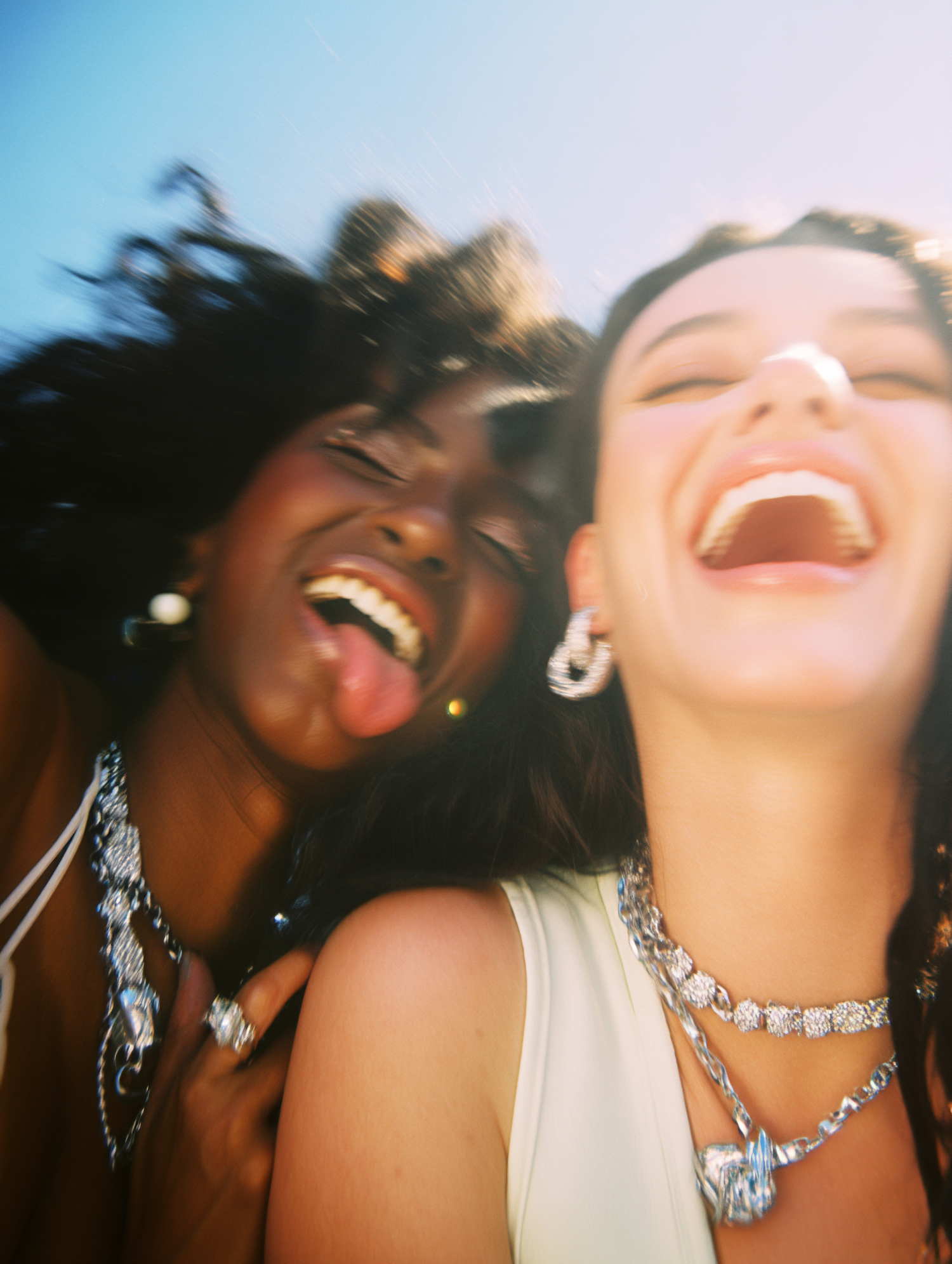 Two women laughing joyfully under the sun, adorned with sparkling silver jewelry, against a bright blue sky.