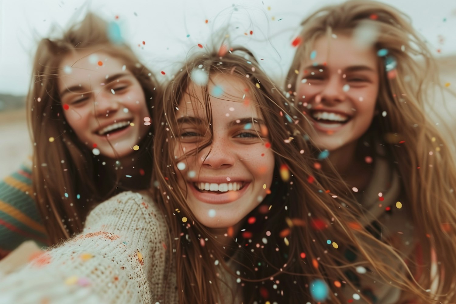 Three young women with long hair joyfully smile amidst colorful confetti, capturing a lively and festive moment.
