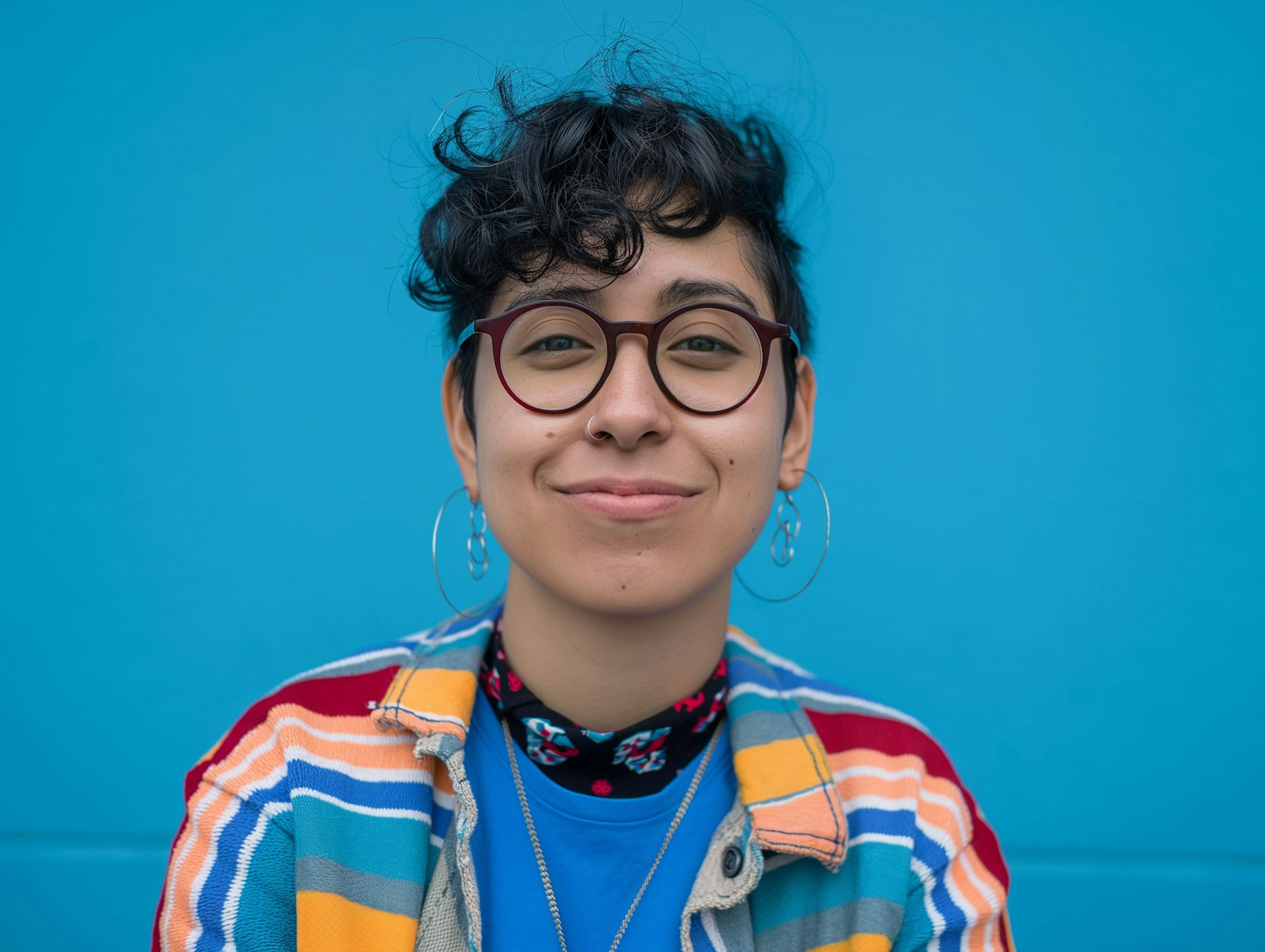 Young person with curly hair, glasses, and colorful striped jacket against a bright blue background, exuding confidence and style.