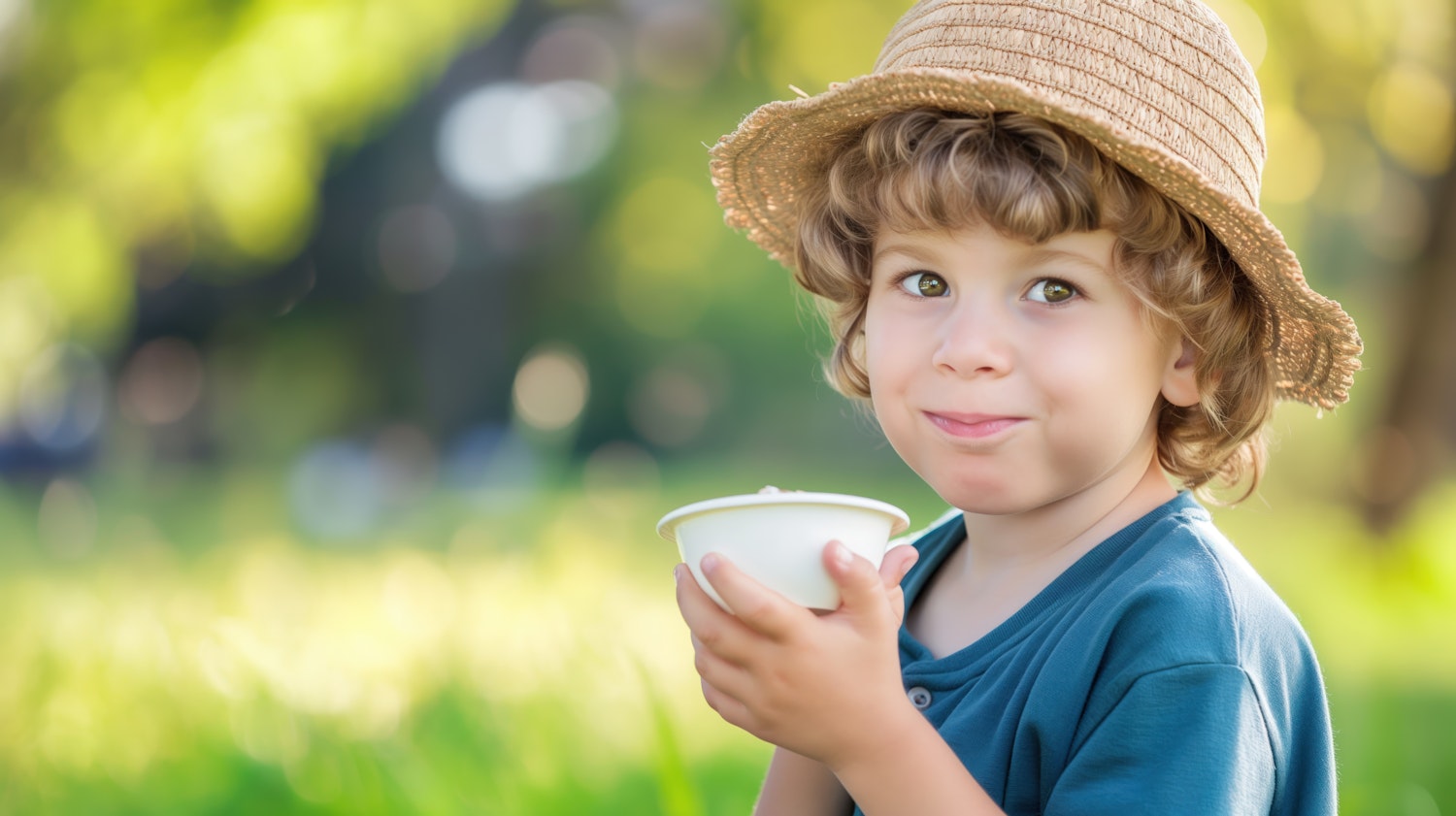 Young boy with curly hair and straw hat holding a cup in a sunny park. Playful expression and vibrant outdoor setting.