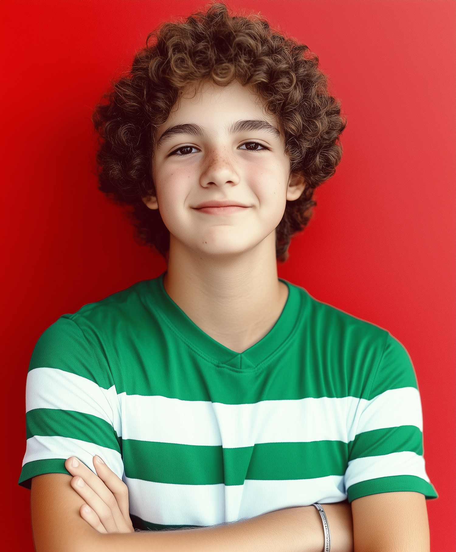 Young boy with curly hair in a green striped shirt against a red background, smiling with arms crossed.