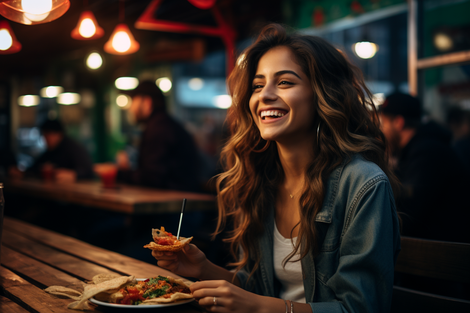 Smiling woman enjoying a meal in a cozy, warmly lit restaurant with a lively atmosphere.