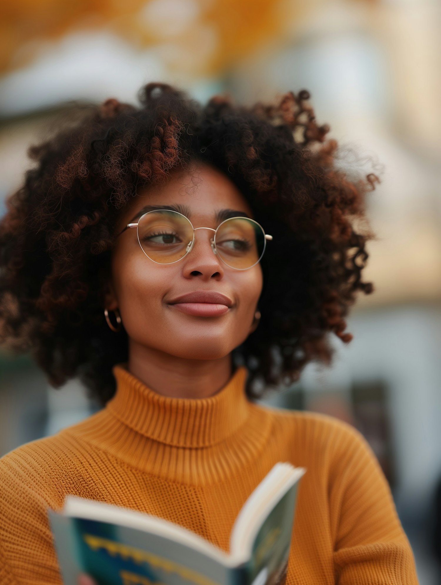 Young woman with curly hair and glasses reading a book outdoors in a mustard sweater, enjoying a peaceful autumn day.