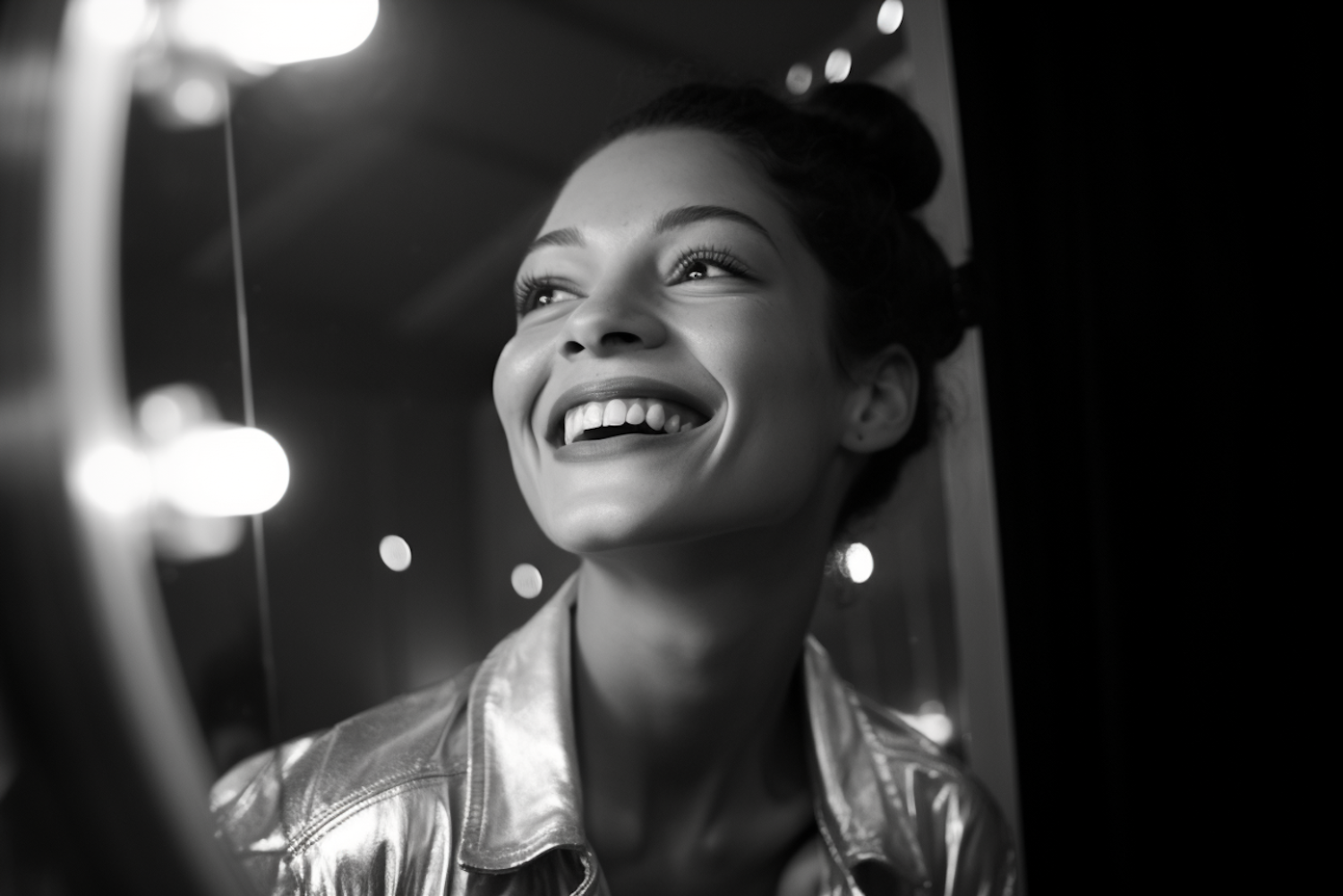 Black and white photo of a smiling woman in a metallic jacket, exuding joy and elegance with soft lighting and blurred background lights.