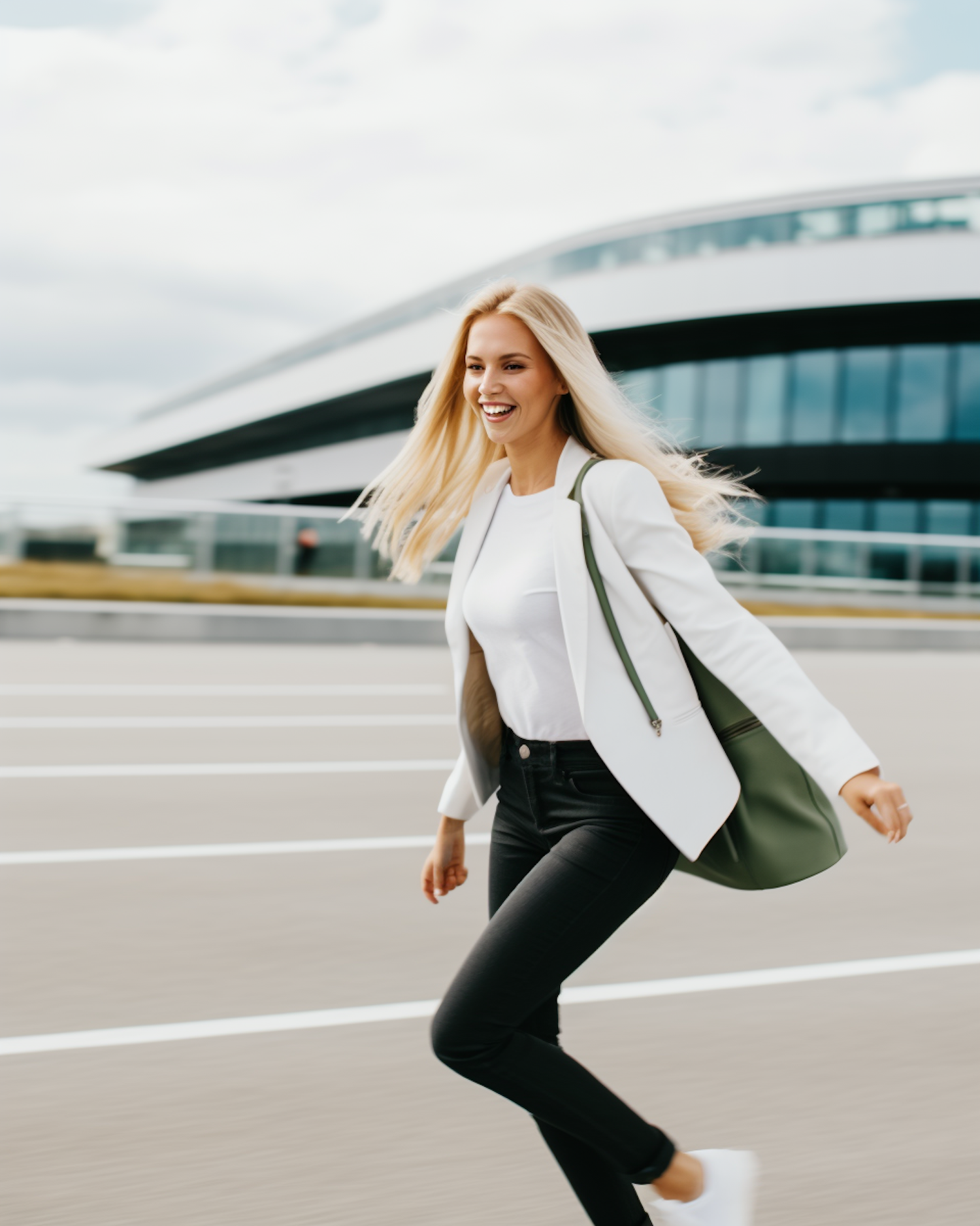 Joyful woman in white blazer and black pants walking outside a modern building, carrying a green bag. Stylish and contemporary vibe.