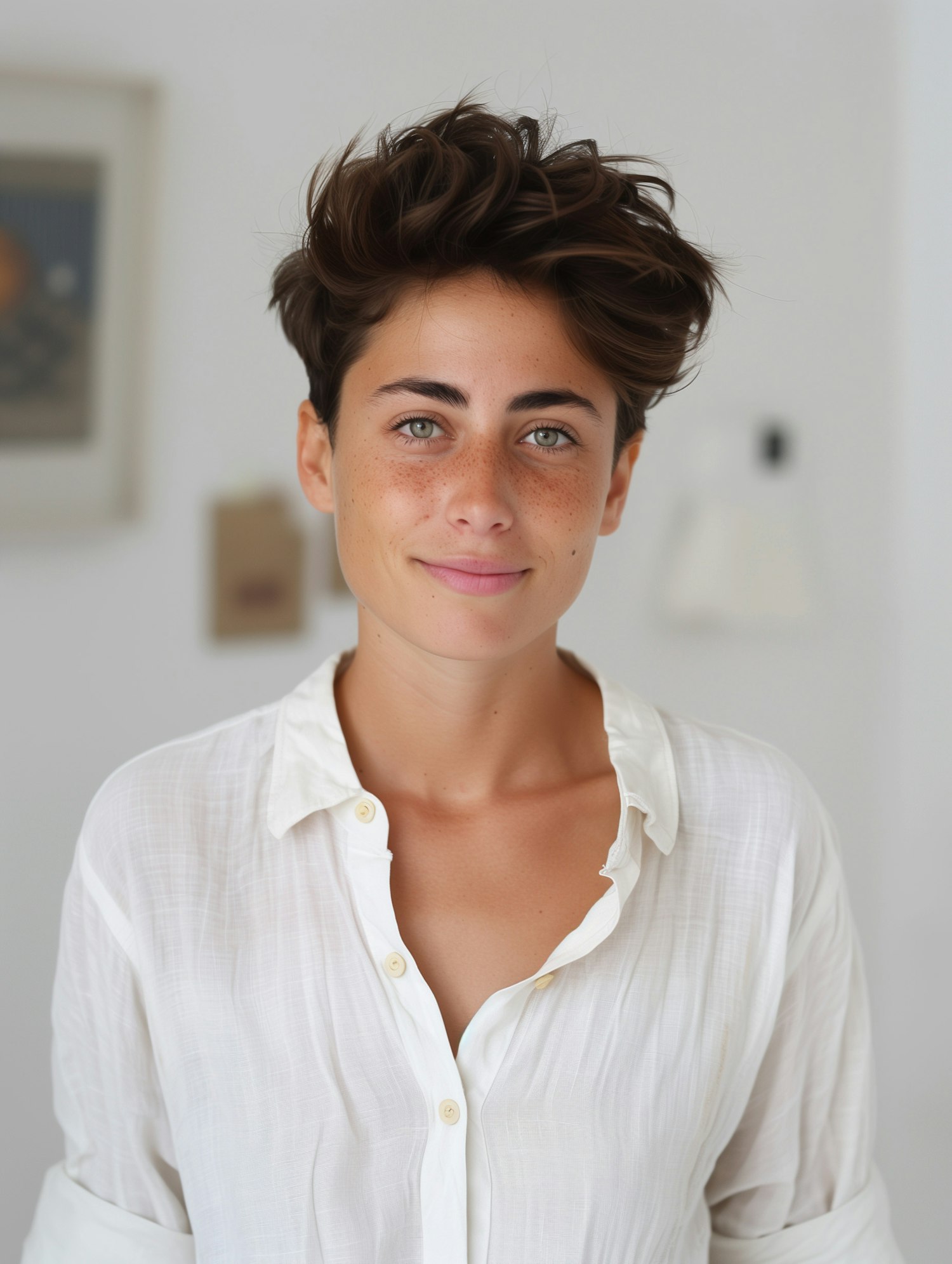 Young woman with short brown hair and green eyes, wearing a white shirt, smiles softly in a bright, neutral-toned room.