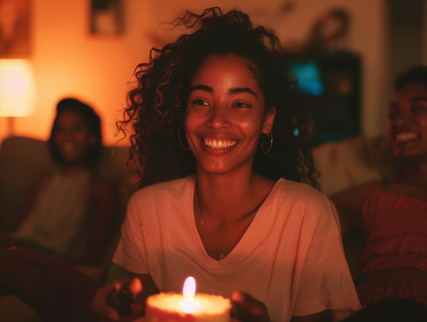 Smiling woman with curly hair enjoying a cozy candlelit evening with friends in a warmly lit room.