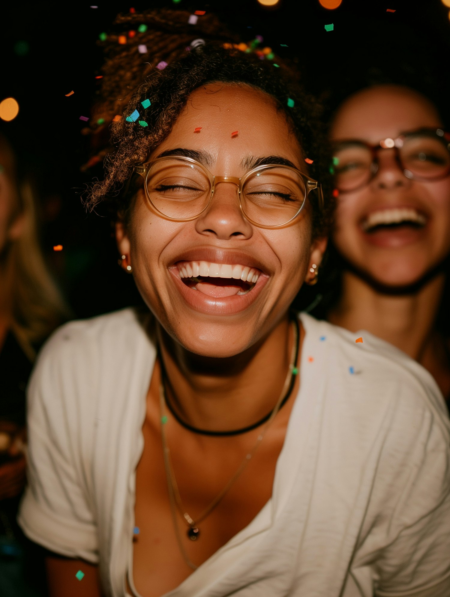 Two women joyfully laughing with confetti in the air, wearing glasses and casual attire, capturing a festive and happy moment.