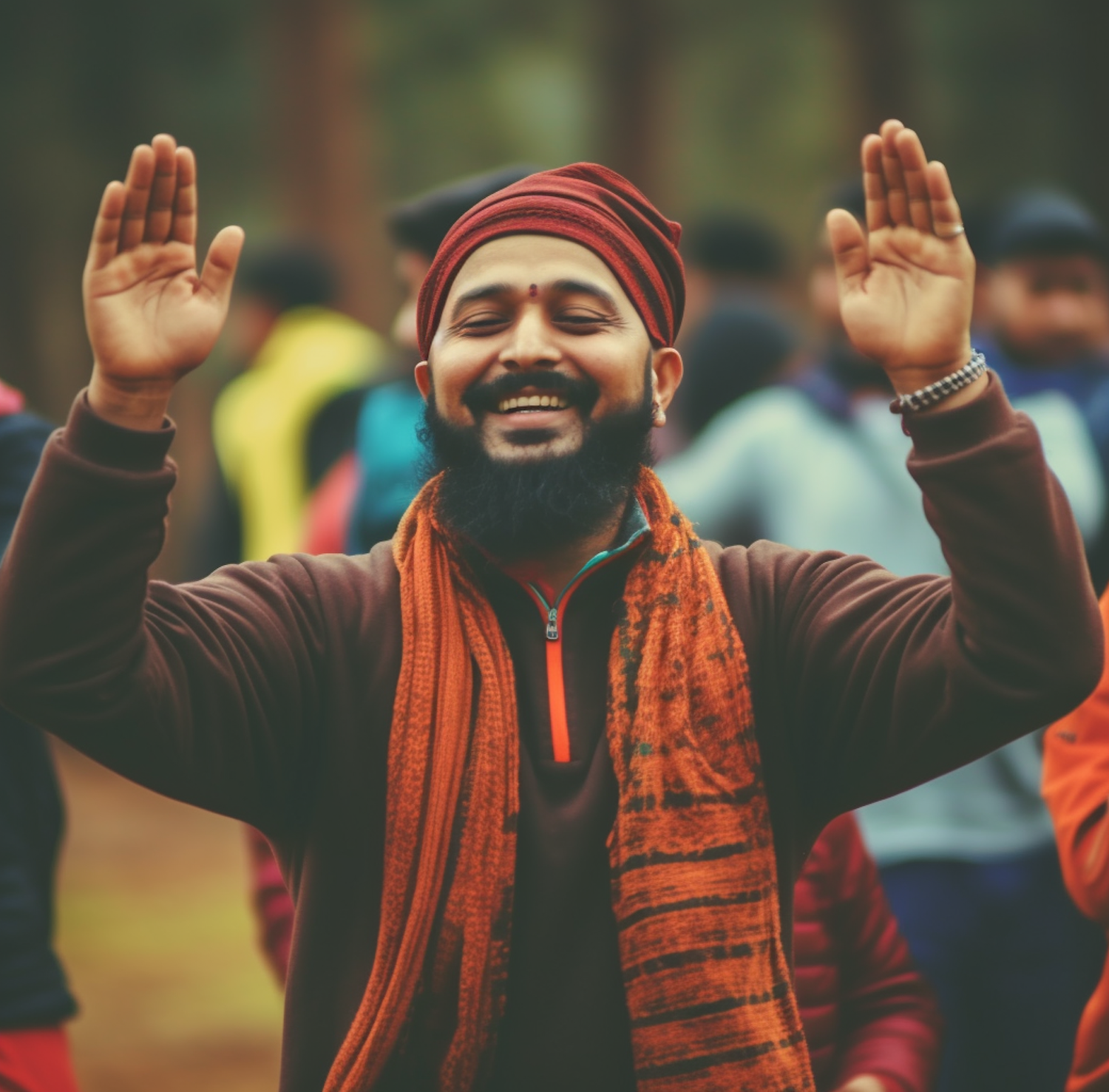 Joyful man with beard and turban, smiling with raised hands in a lively outdoor setting. Warm colors and cheerful atmosphere.