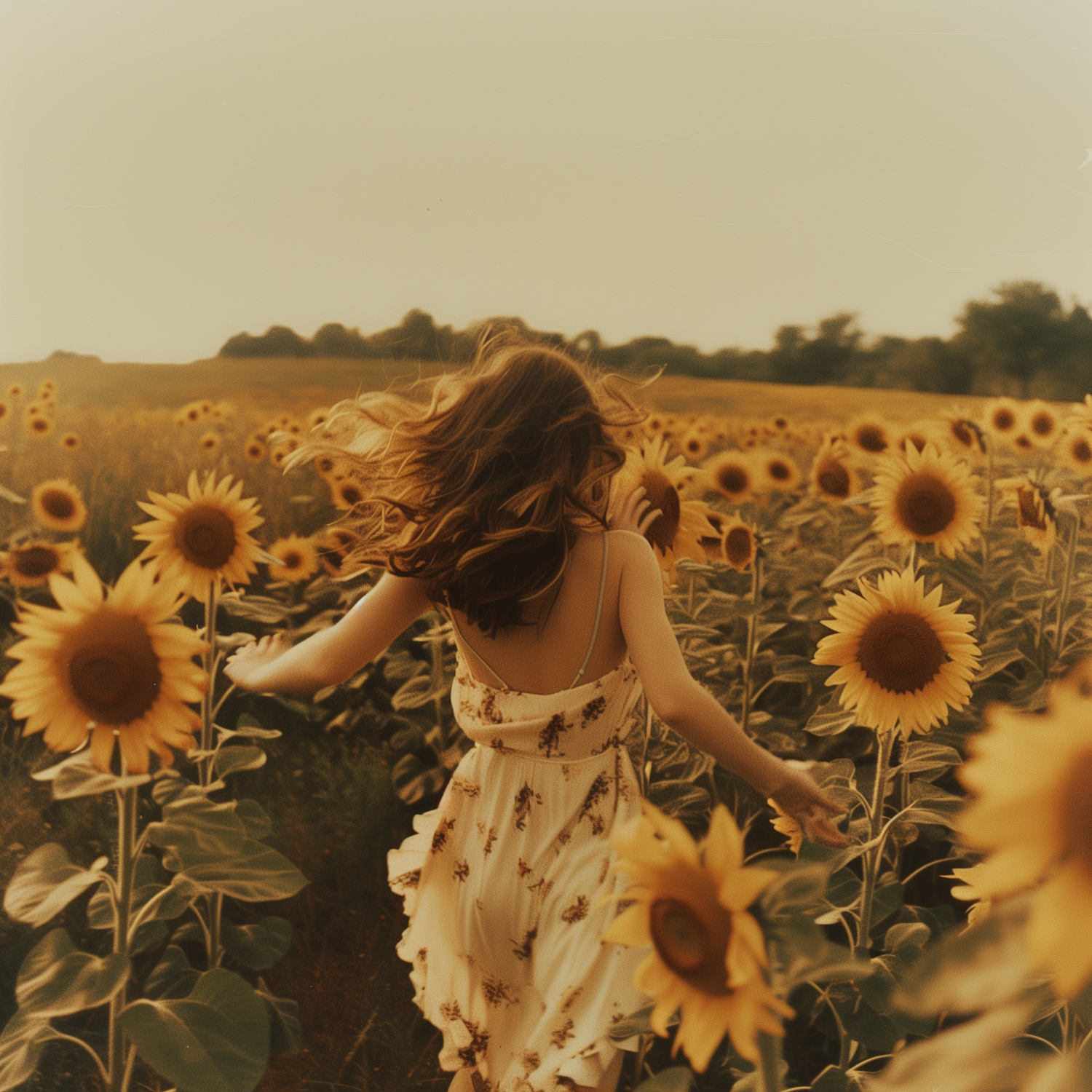 A woman in a floral dress runs through a sunflower field, her hair flowing in the warm, golden light of the setting sun.
