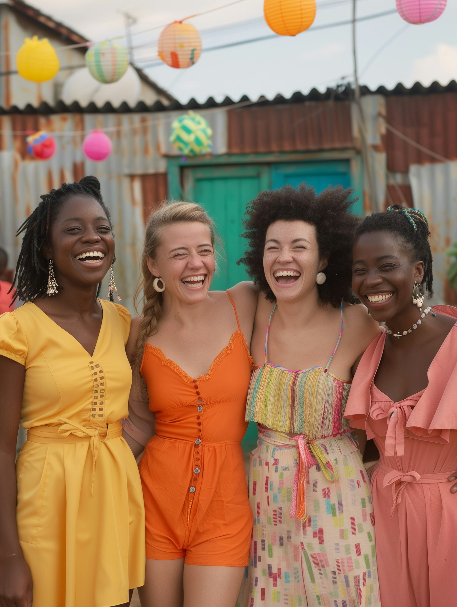 Four women laughing together in colorful outfits with festive lanterns in the background.