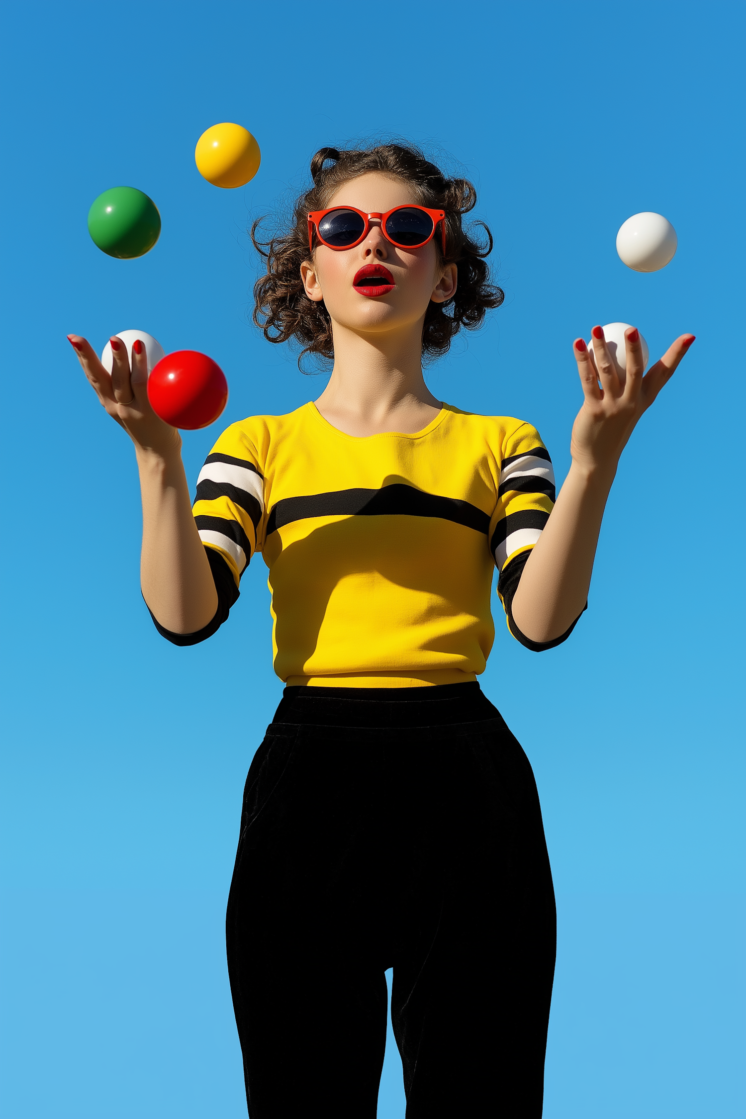 Woman in red sunglasses juggling colorful balls against a blue sky, wearing a yellow top with striped sleeves.