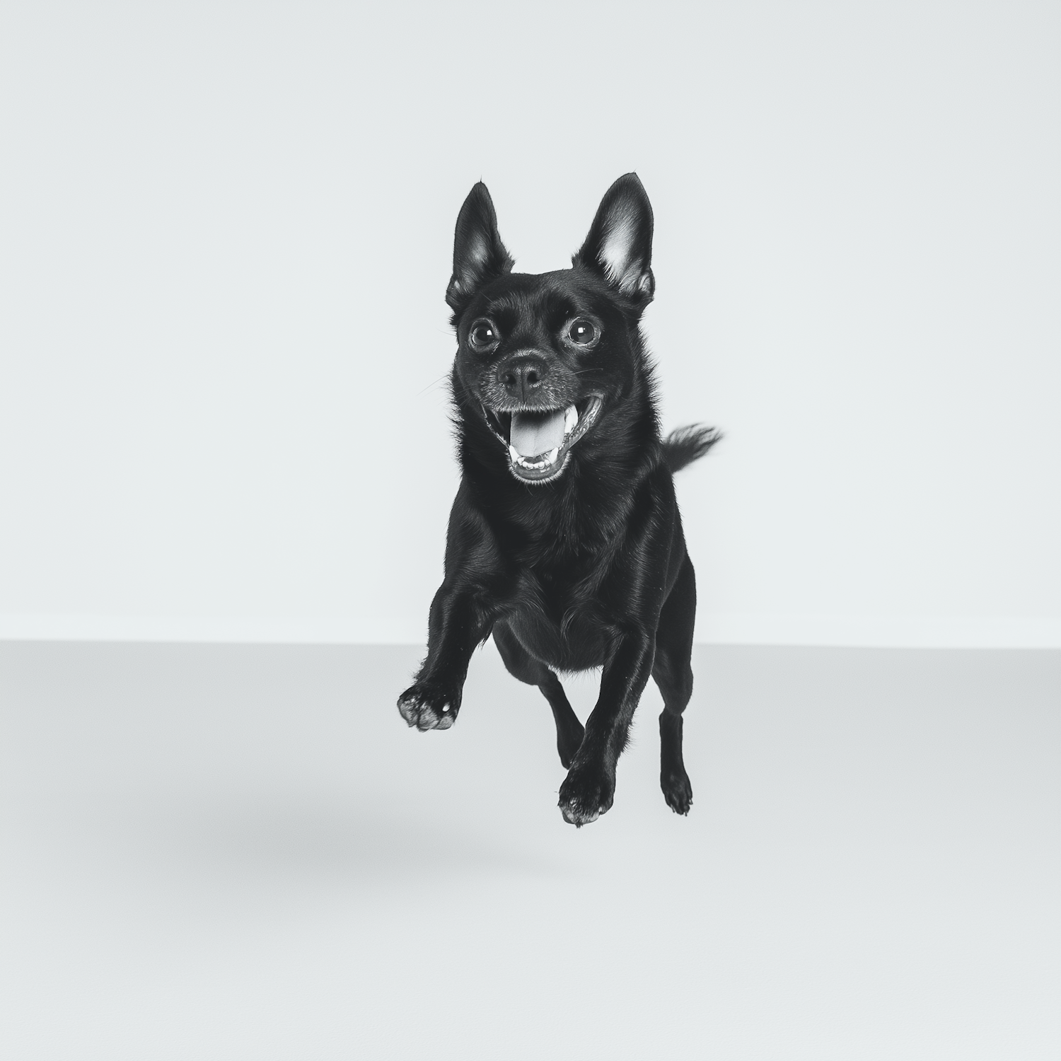 Energetic black dog leaping mid-air with a joyful expression against a minimalistic background.